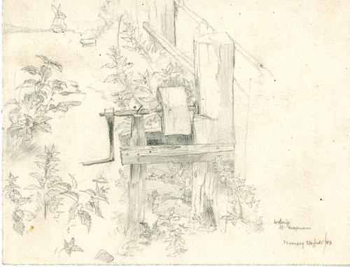 Tekening met potlood van een slijpsteen op een erf b...