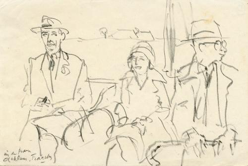 Tekening met potlood van twee mannen en een vrouw in...