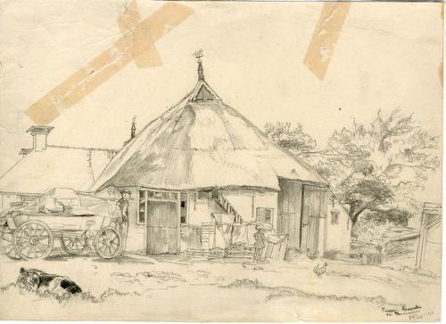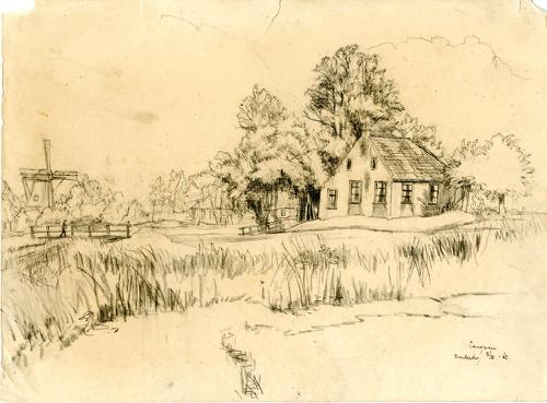 Tekening met potlood van een boerderij tussen Franek...