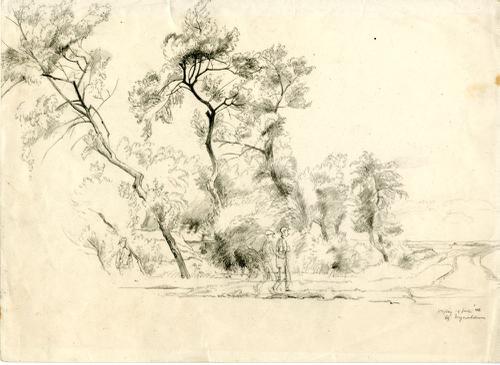 Tekening met potlood van een landschap met bomen bij...