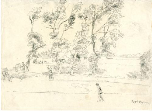 Tekening met potlood van een landschap langs de Dong...