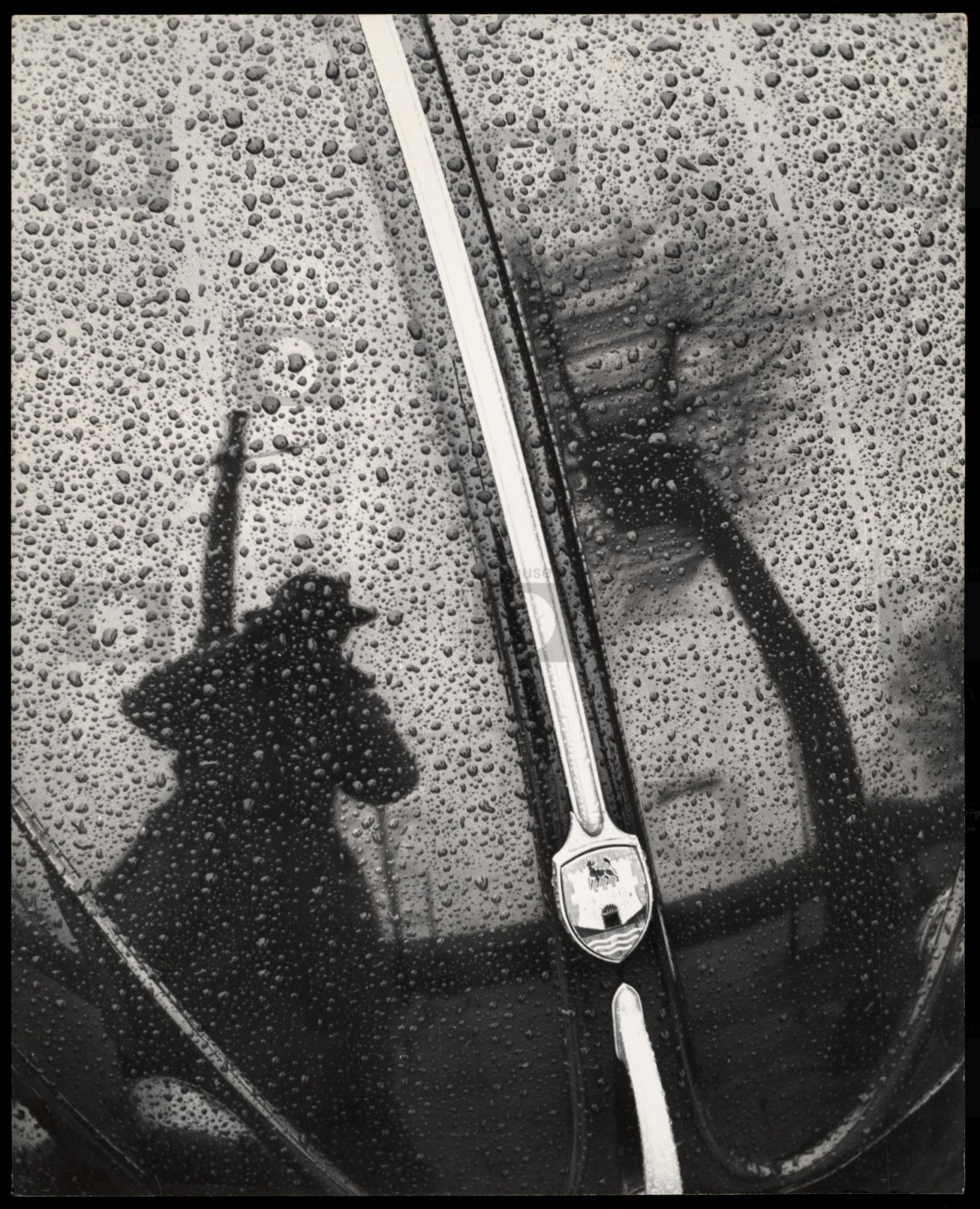 Volkswagenmotorkap met waterdruppels en silhouette v...