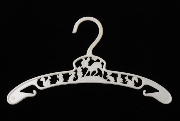 Drie kleerhangers van crème kunststof met afbeelding...