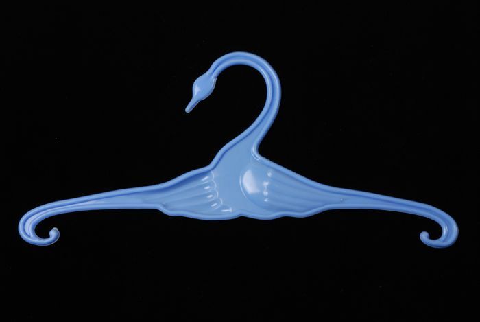 Zes kleerhangers van blauwe kunststof met afbeelding...