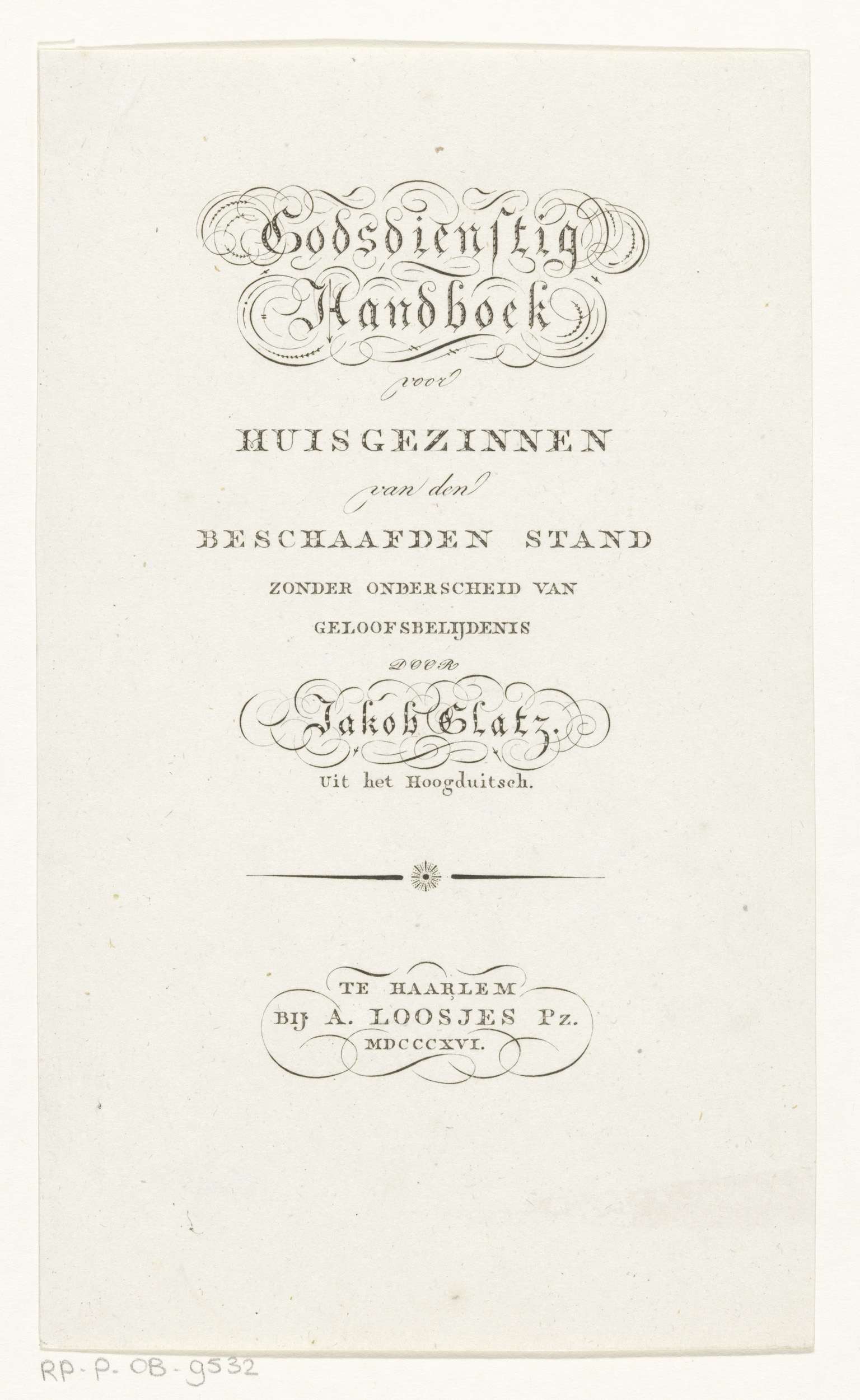 Titelpagina voor: Jakob Glatz, Godsdienstig Handboek...