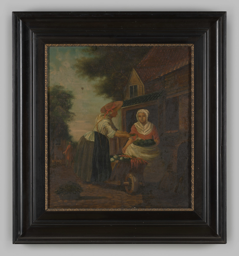 Marktscène met een groentenverkoopster