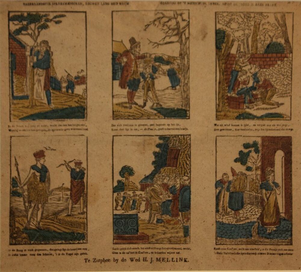 Centsprent met zestien prentjes over scènes uit de 8...