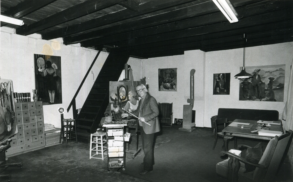 Zwart-wit foto van de schilder Tonny Ross in zijn ni...