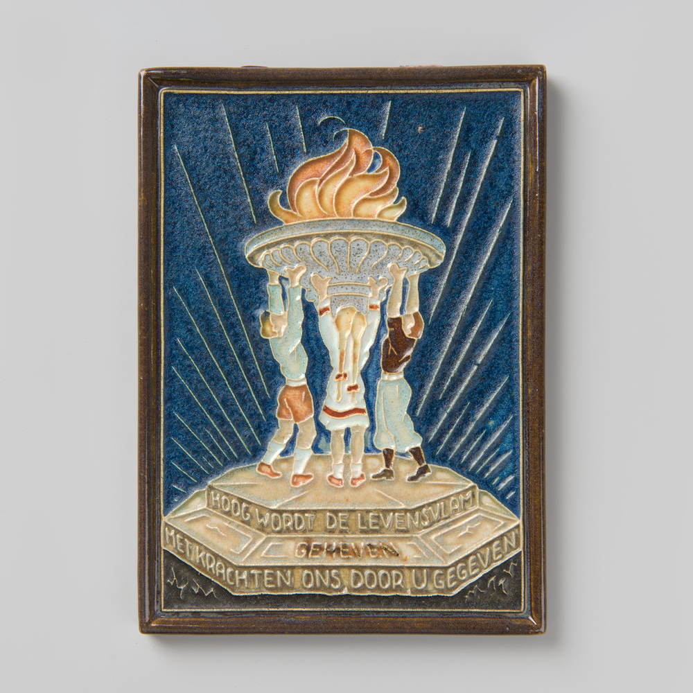 Tegel in cloisonné-techniek, met voorstelling: Kinde...