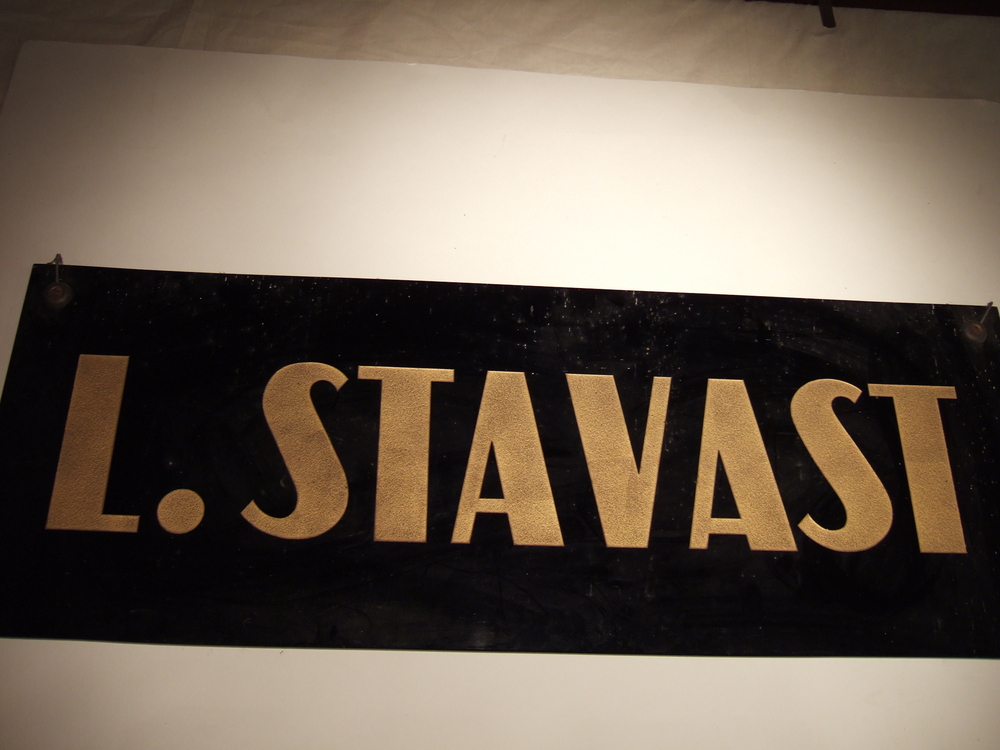 Reclameplaat van glas met geëtste letters L. Stavast...