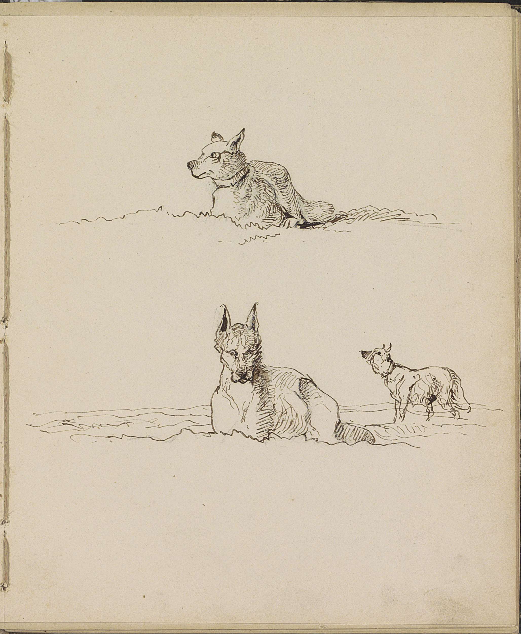 Twee liggende en één staande hond