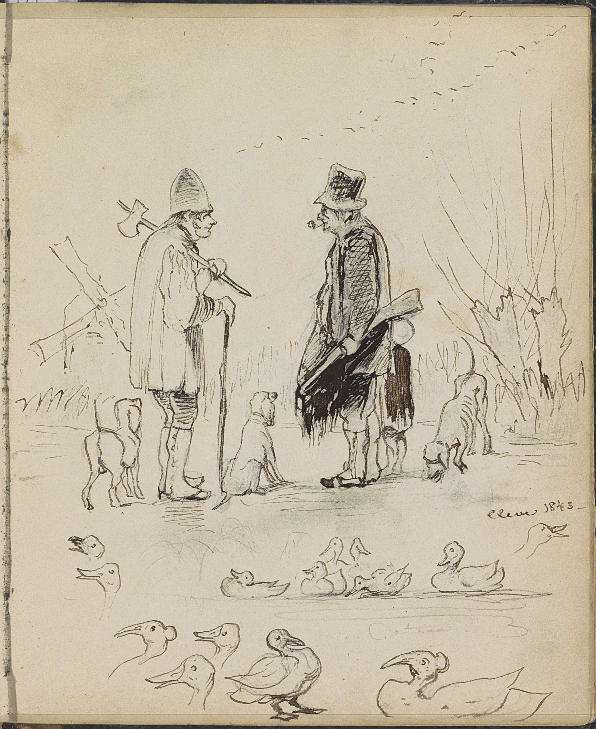 Jagers, één met een pijp en een geweer over de schouder