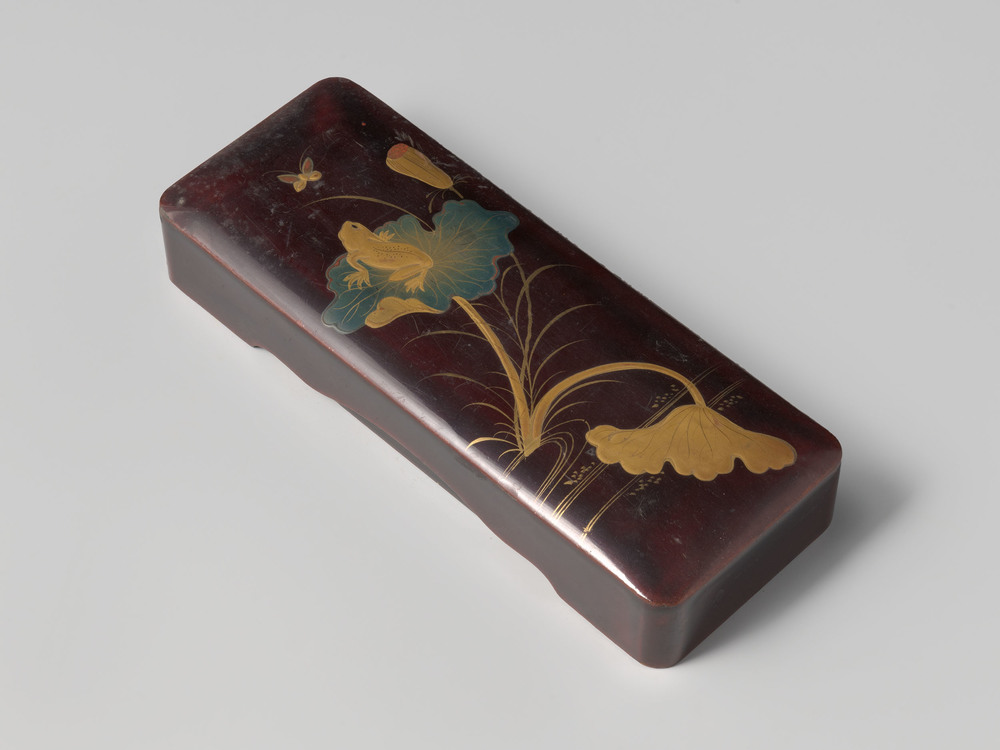 Bruingelakte doos met een kikker