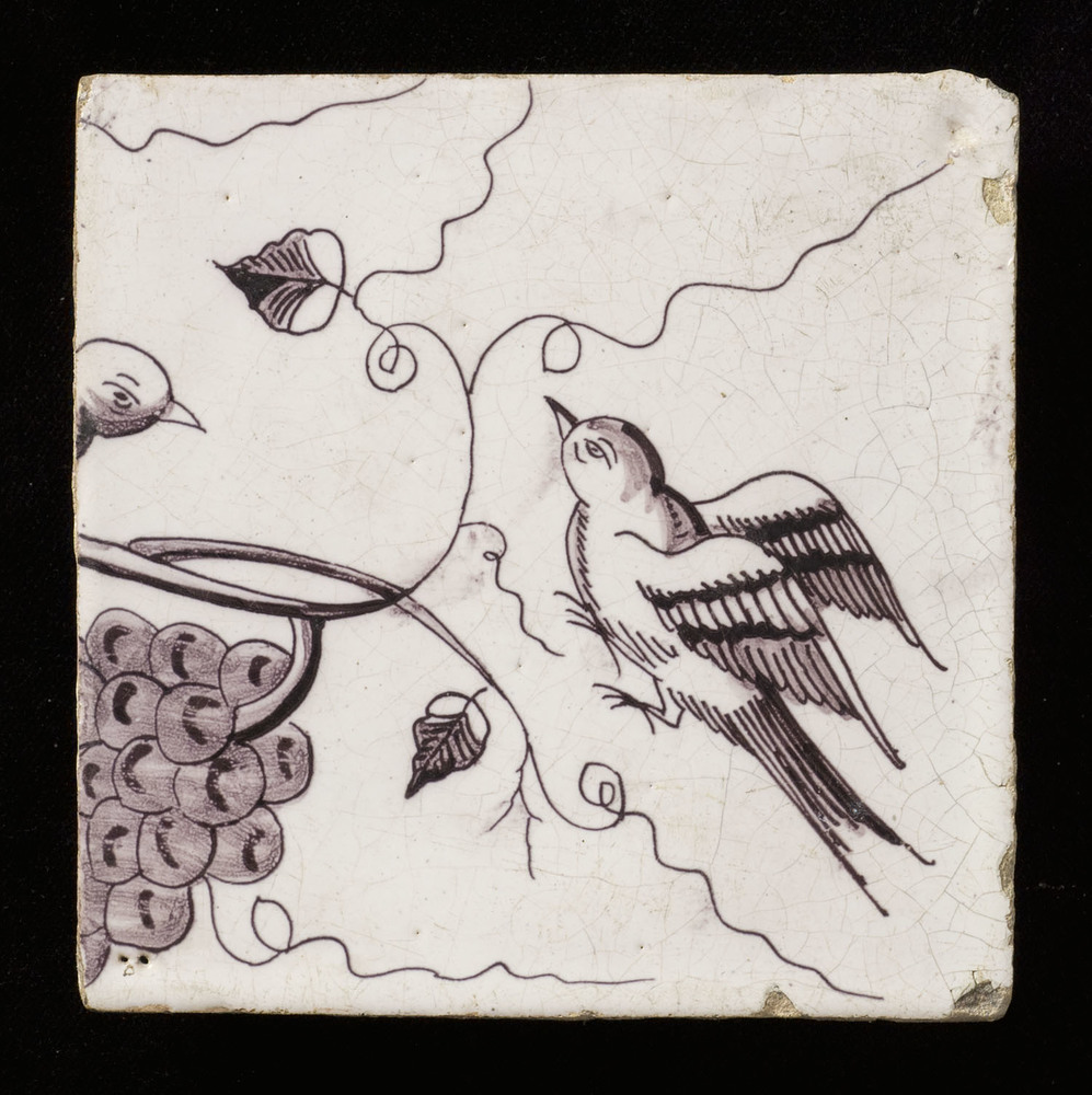Tegel in tinglazuur, voorstellende vogel met druiven...