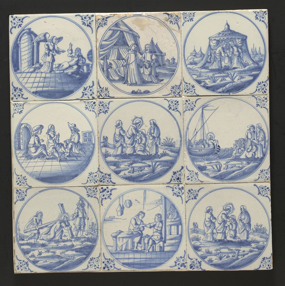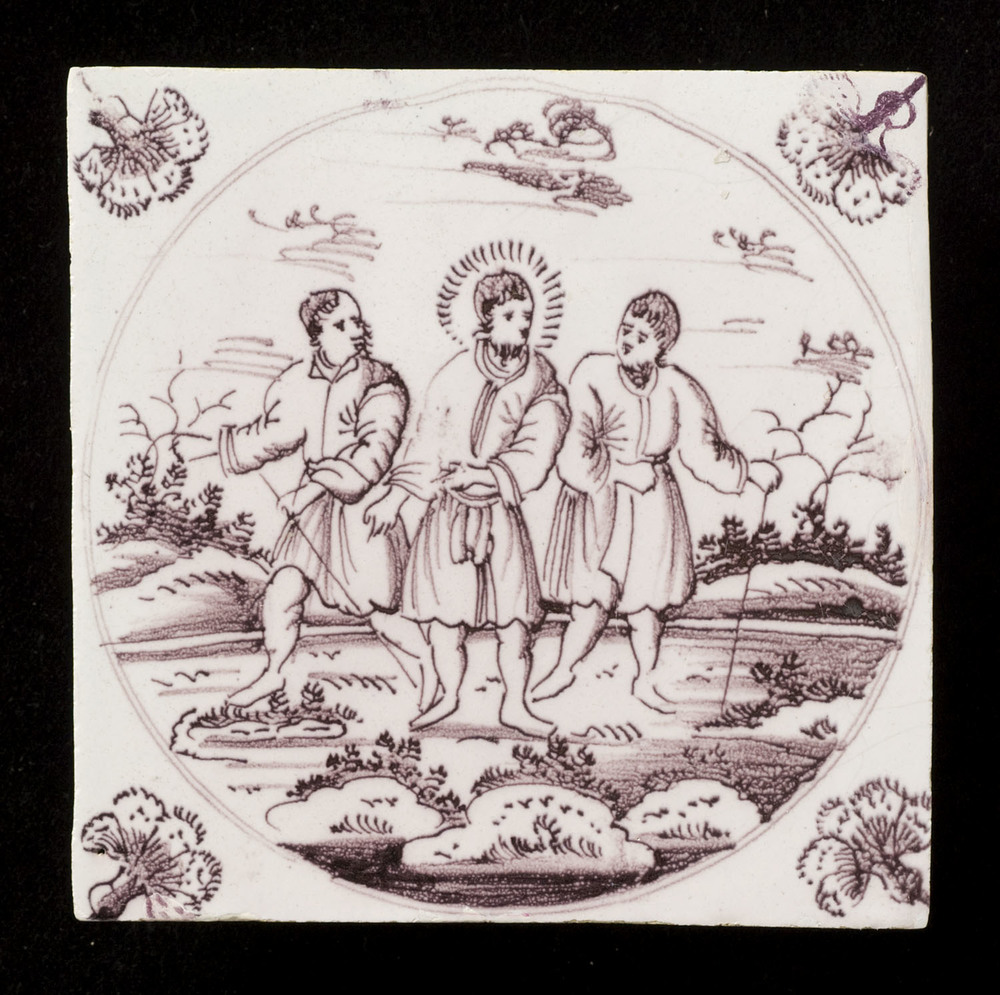 Tegel van keramiek met tinglazuur, voorstellende: De...