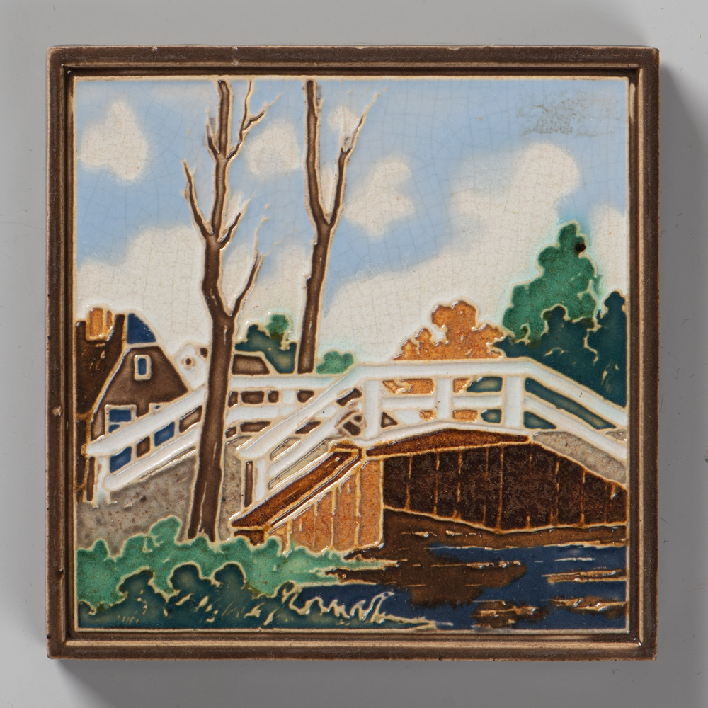 Tegel in cloisonné-techniek, met voorstelling: huis ...