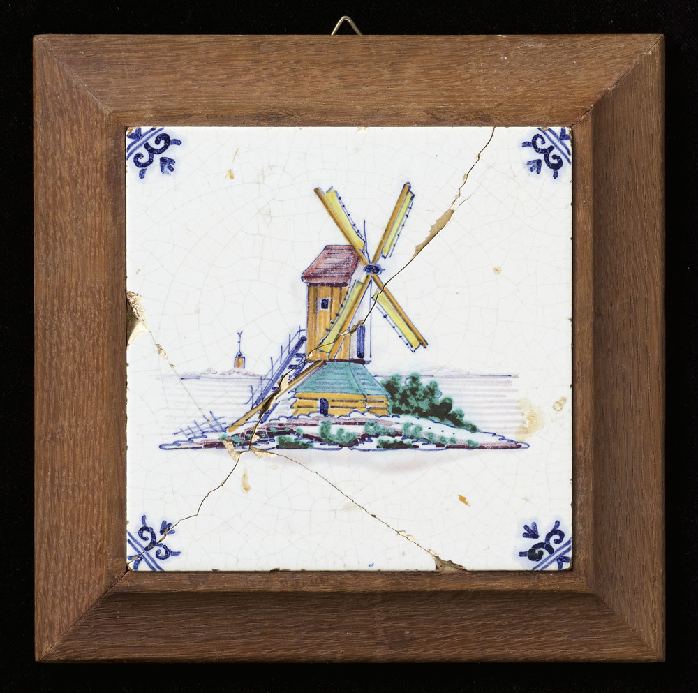 Tegel in tinglazuur, met voorstelling: molen, vervaa...