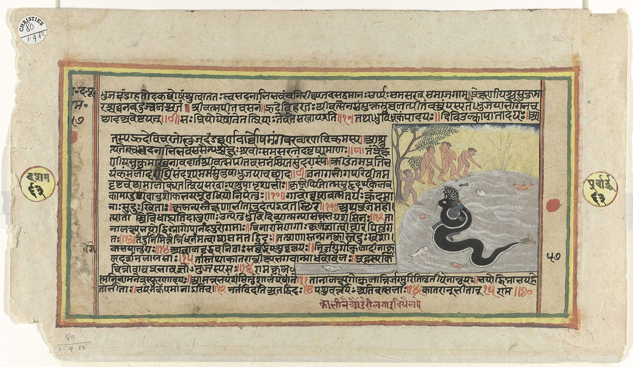 Krishna bestrijdt de slang Kalya terwijl vier herder...