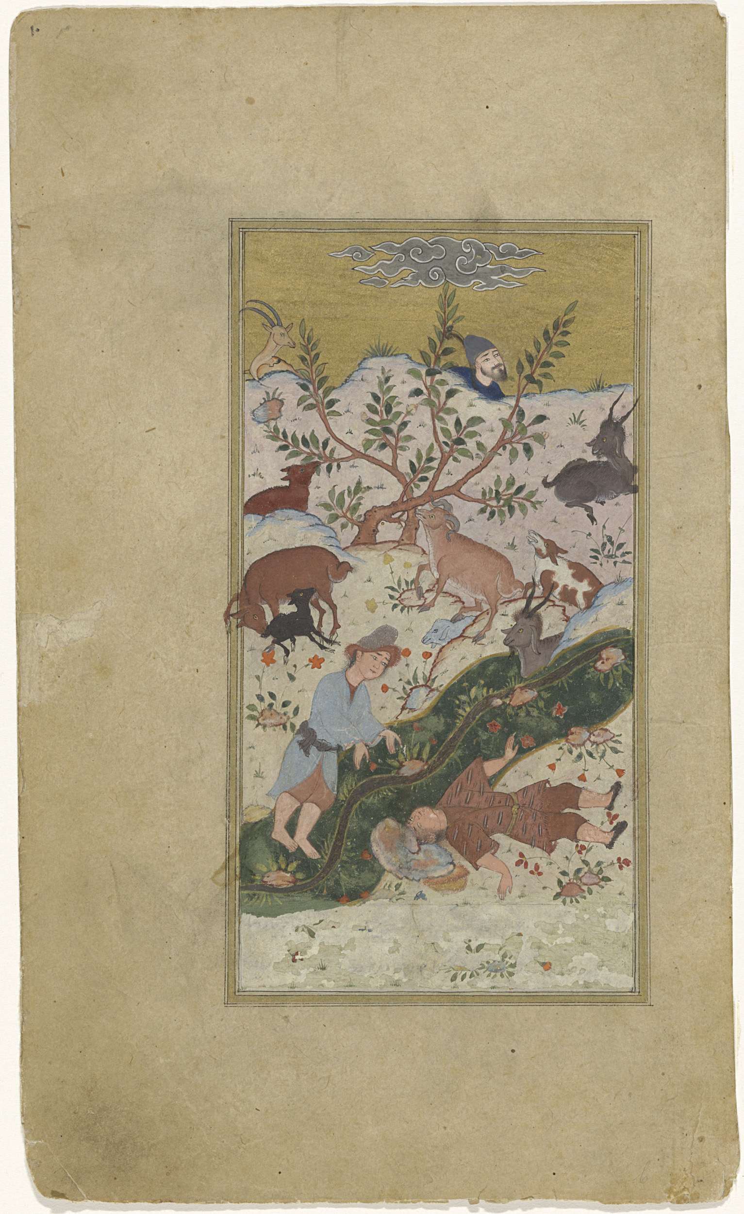 Twee liggende figuren in een arcadisch landschap