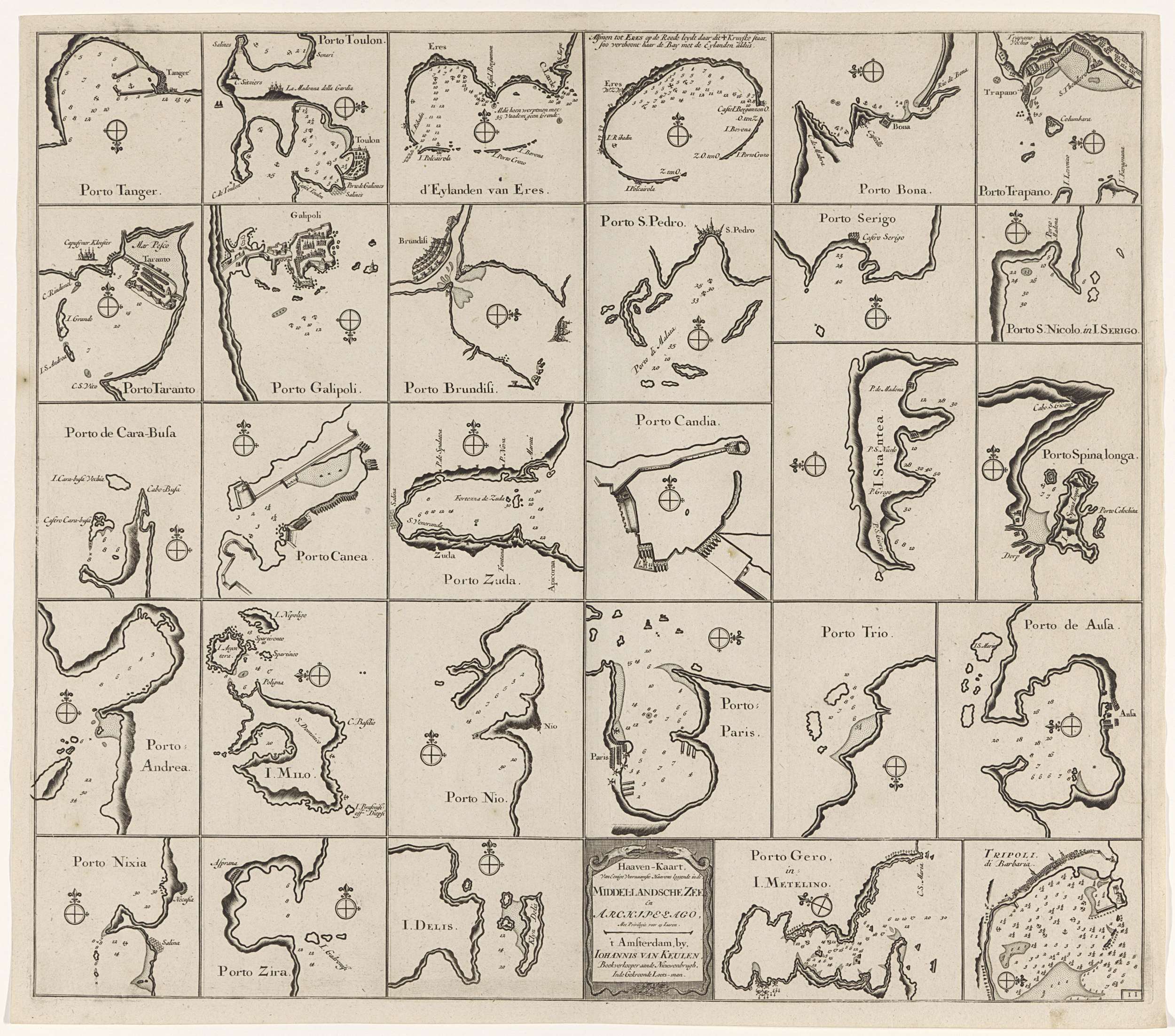 Blad met 29 kaartjes van havens en reden aan de Midd...