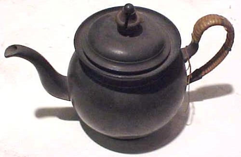 theepot van tin, vaasvormig, oor met riet omwonden e...