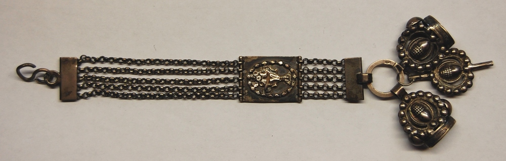 chatelaine van zilver met kettinkjes, twee signetten...