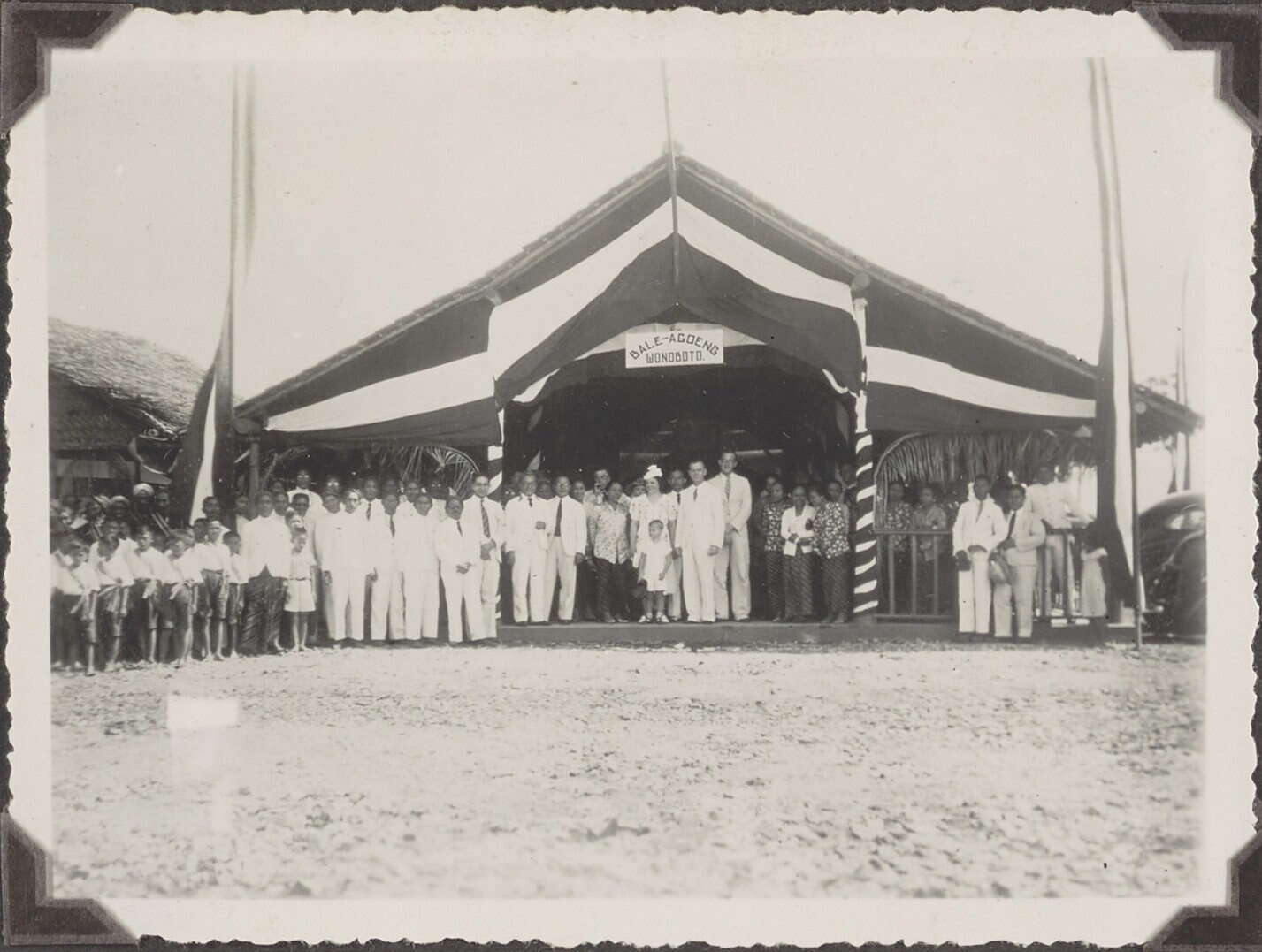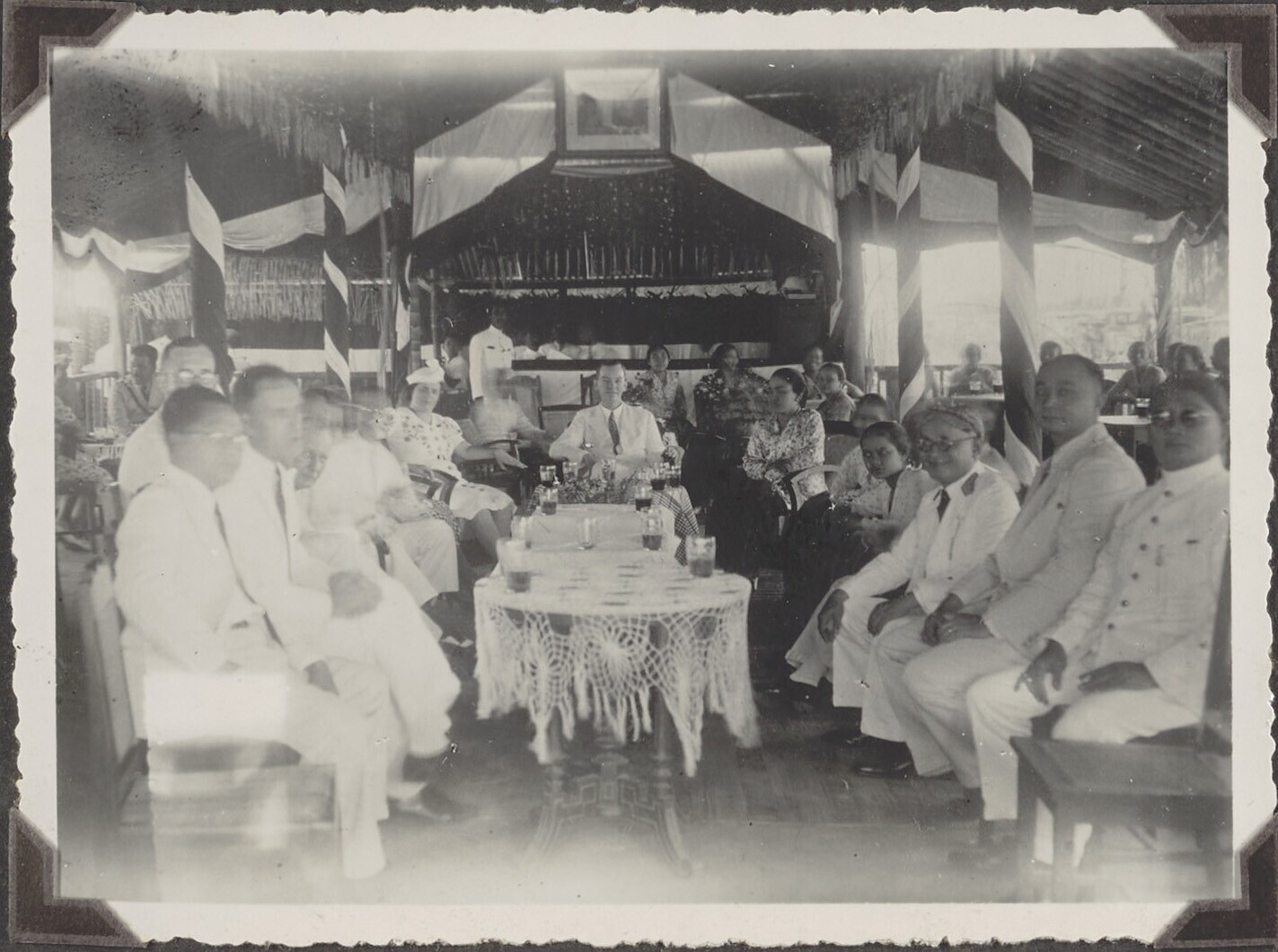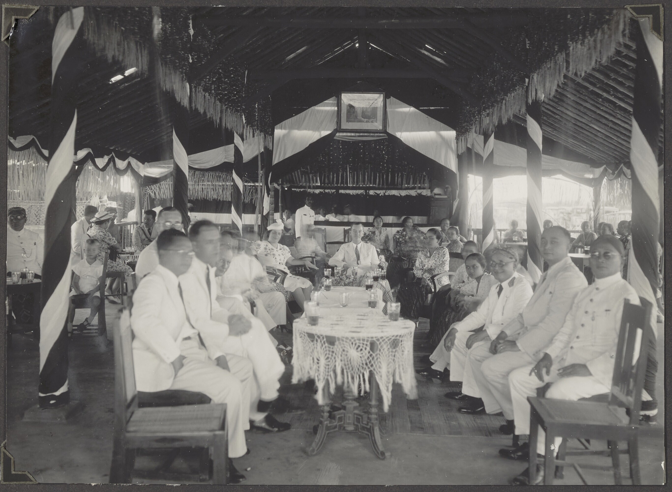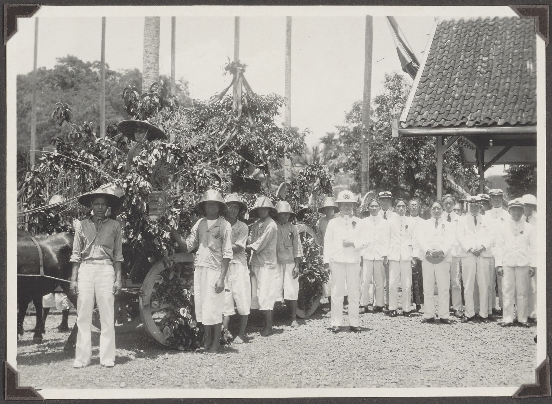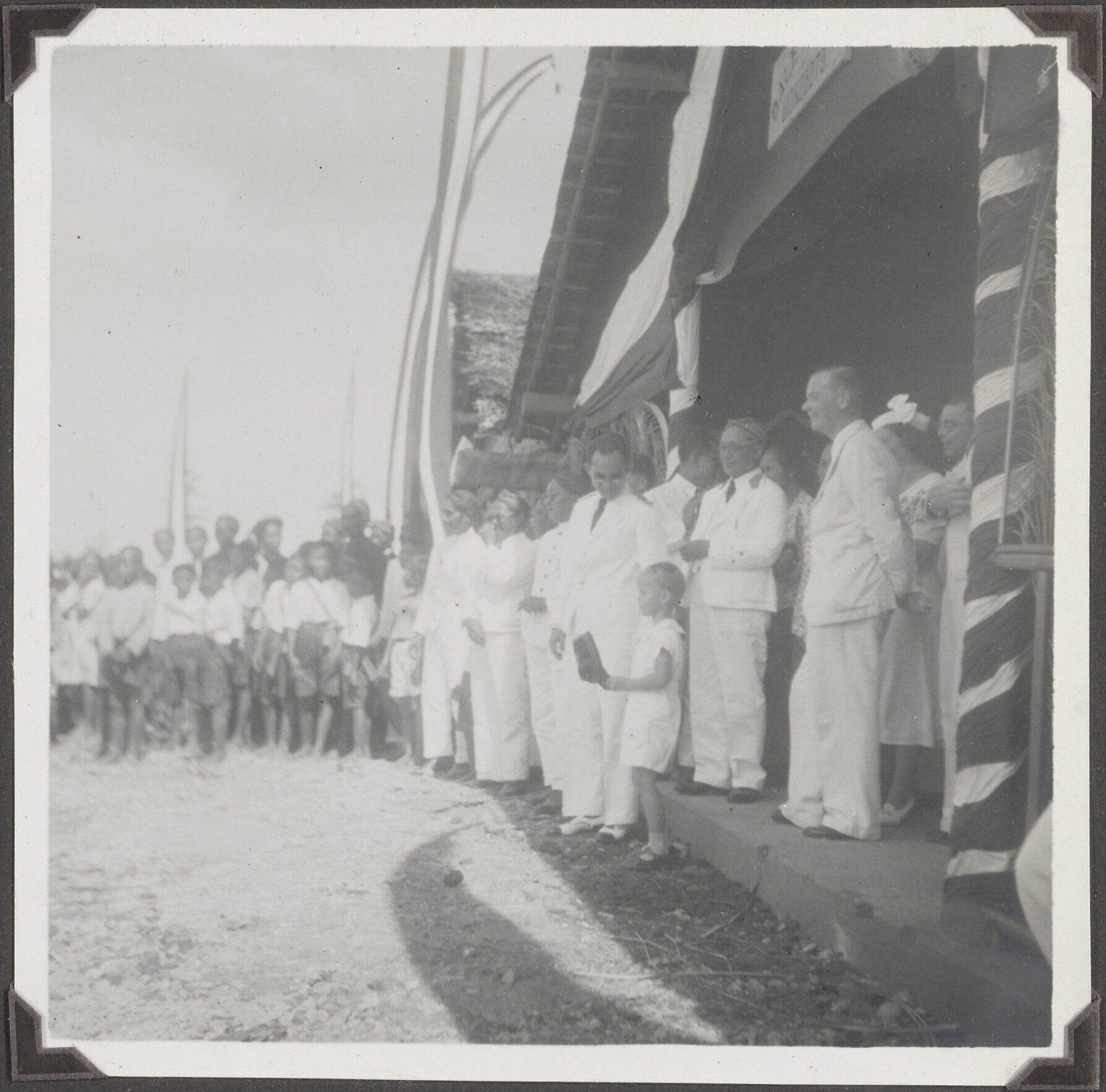 Ambtenaren bij een erepoort voor de ontvangst van Go...