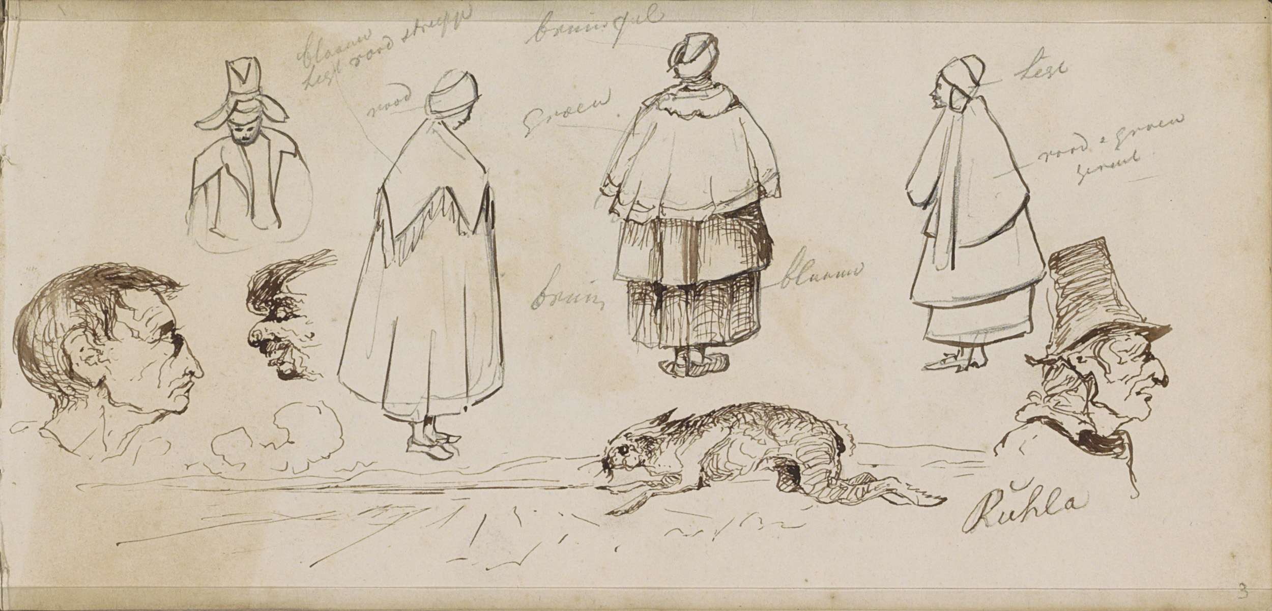 Haas, vrouwen in mantels met kappen en mannenkoppen