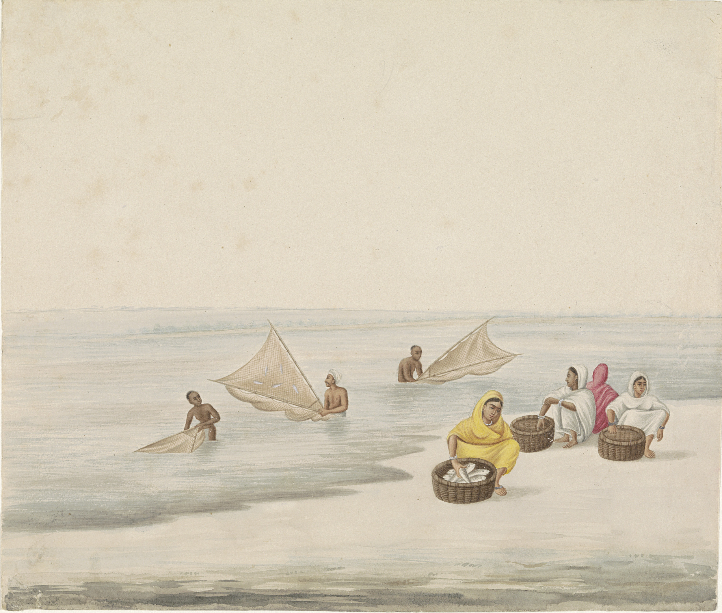 Vissers en vrouwen langs het water