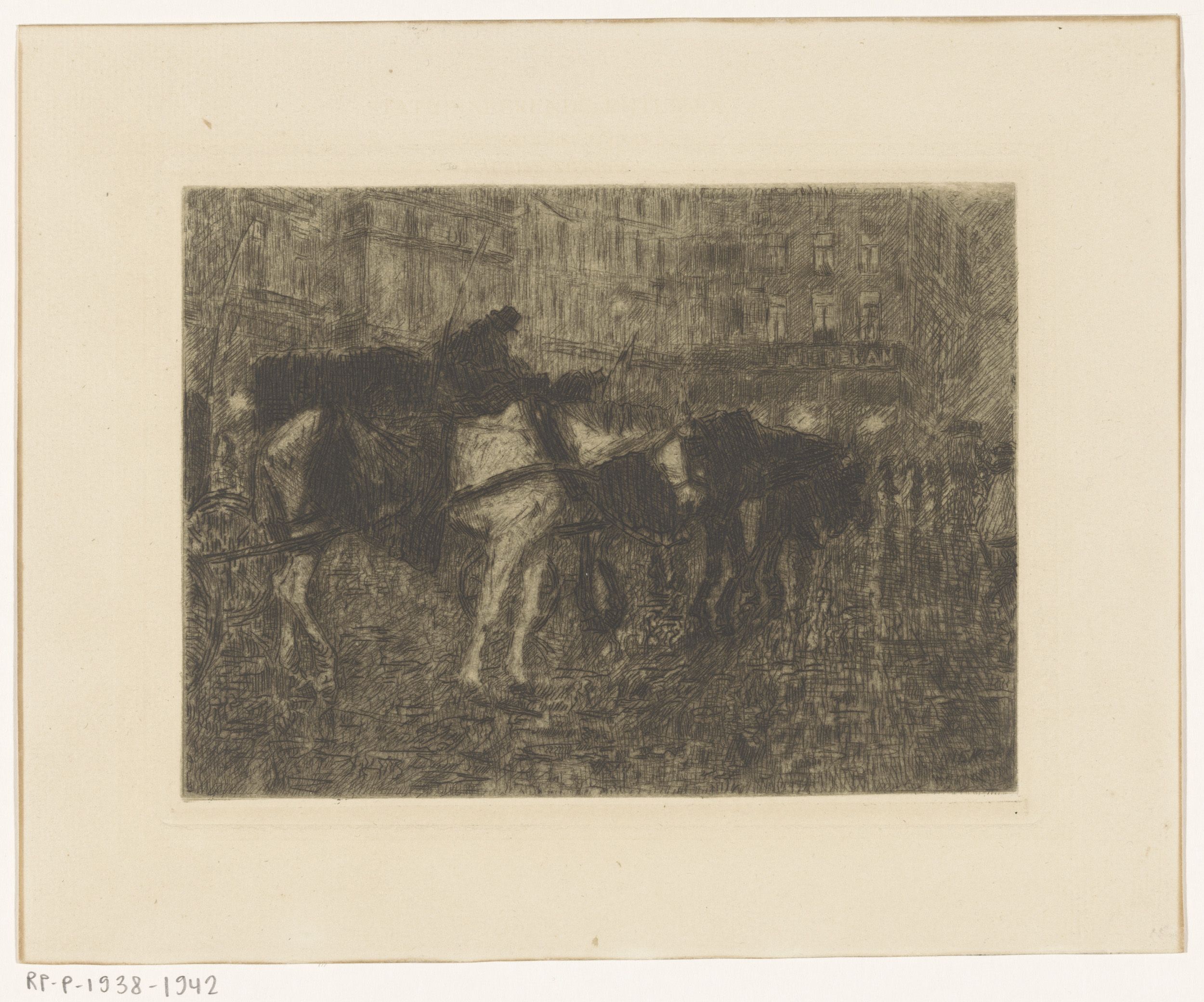 Koetspaarden op een stadsplein bij avond