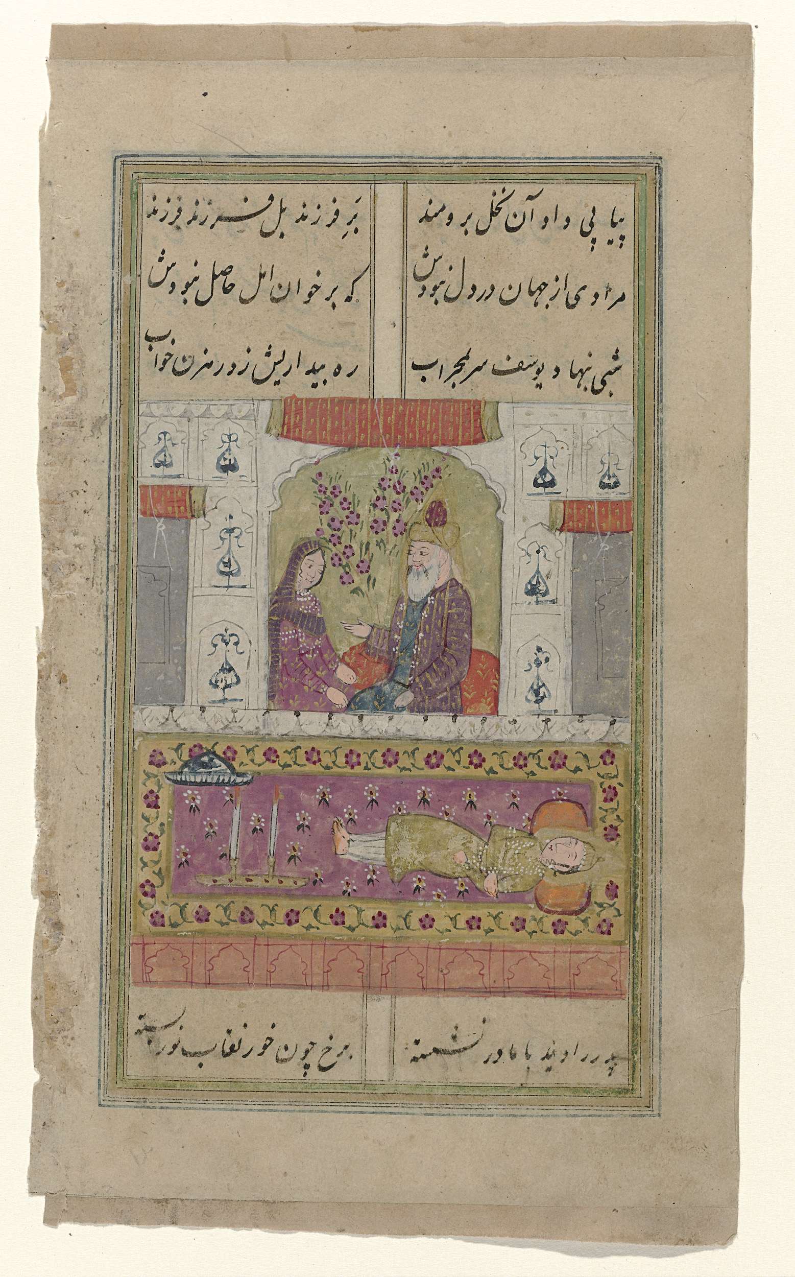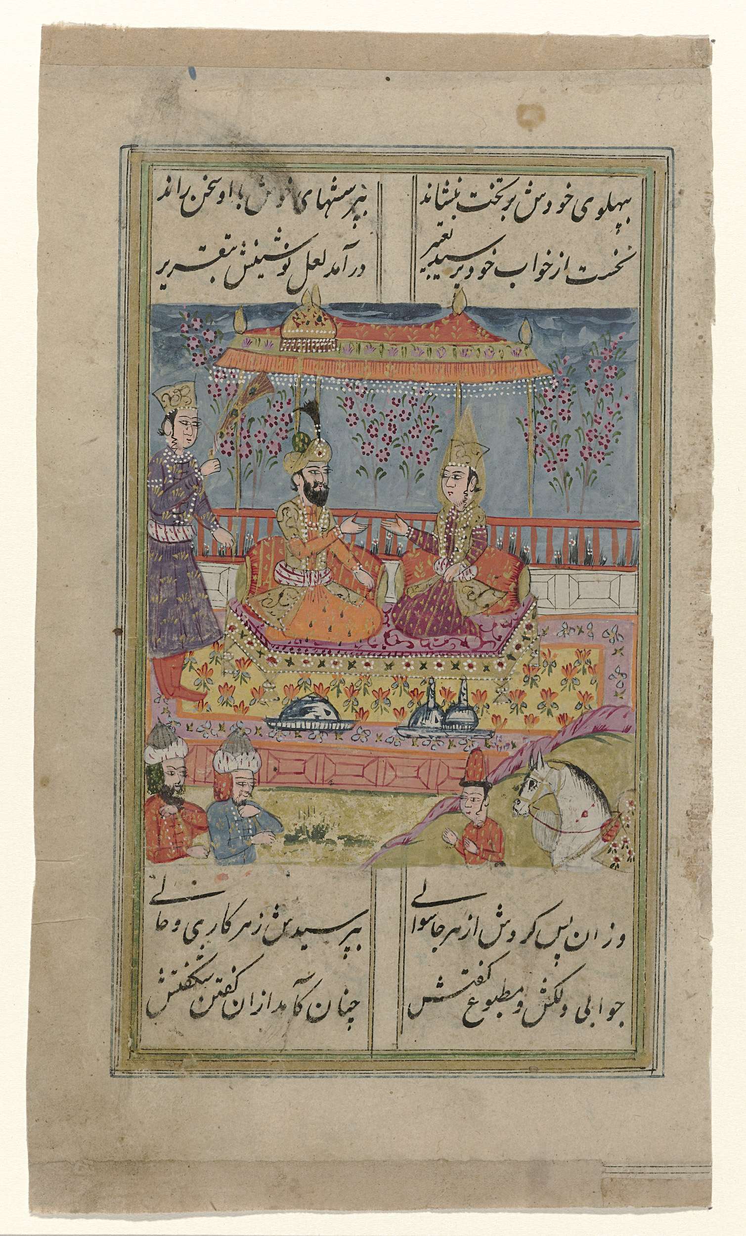 Twee Oosterse figuren onder een baldakijn op een terras