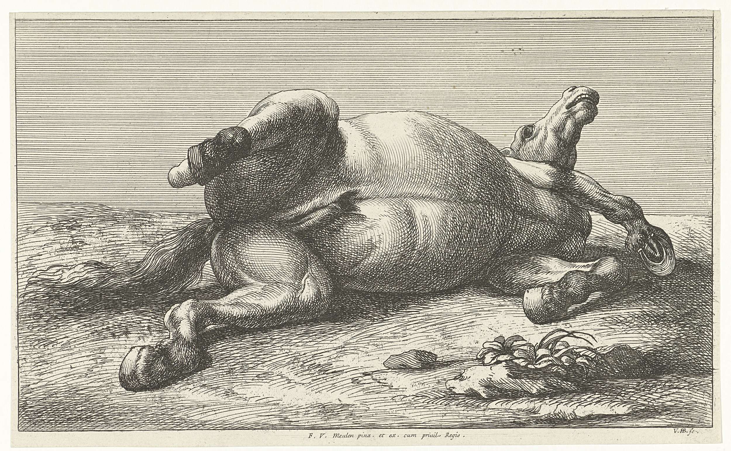 Twee gesneuvelde paarden waarvan de linker van voren...