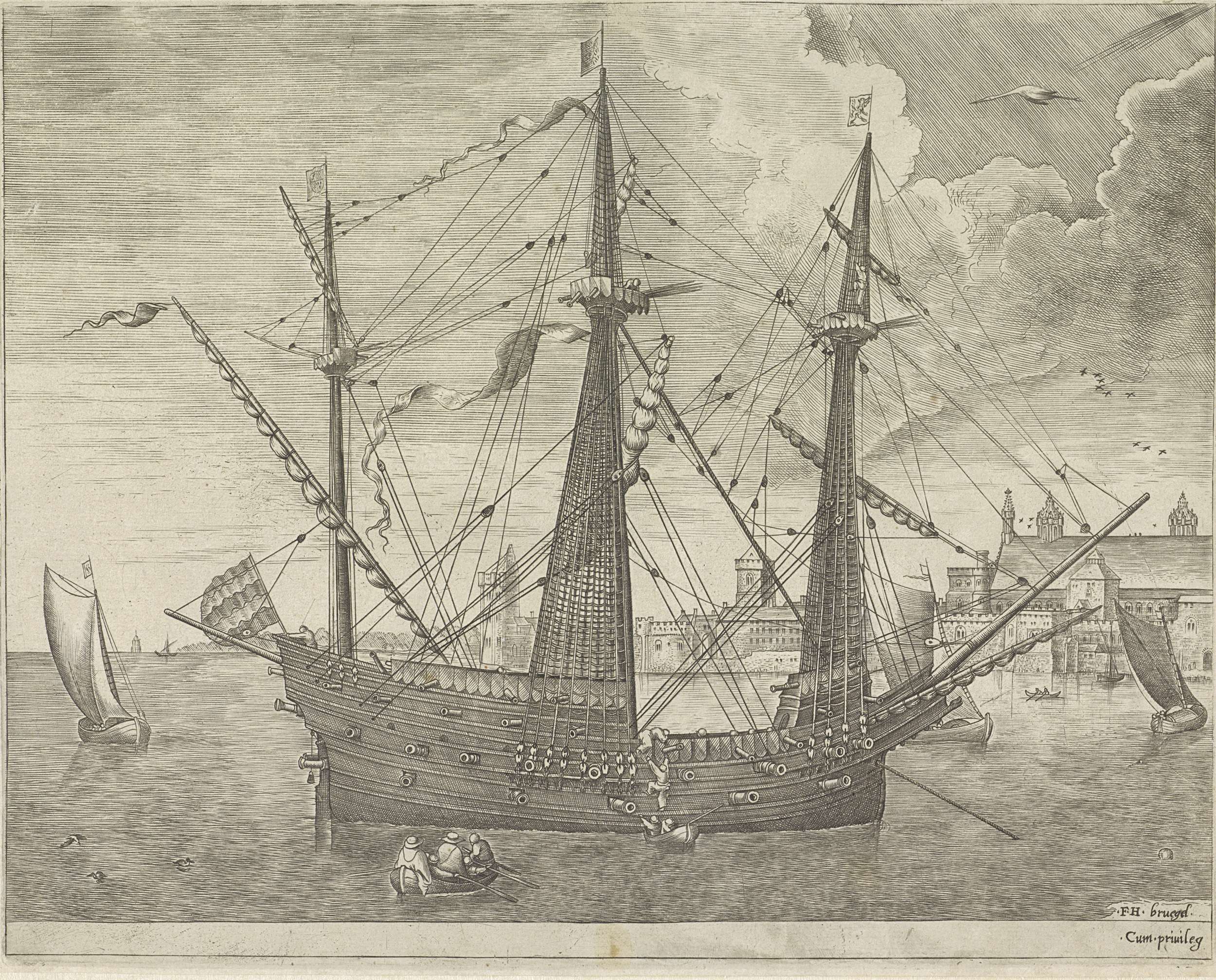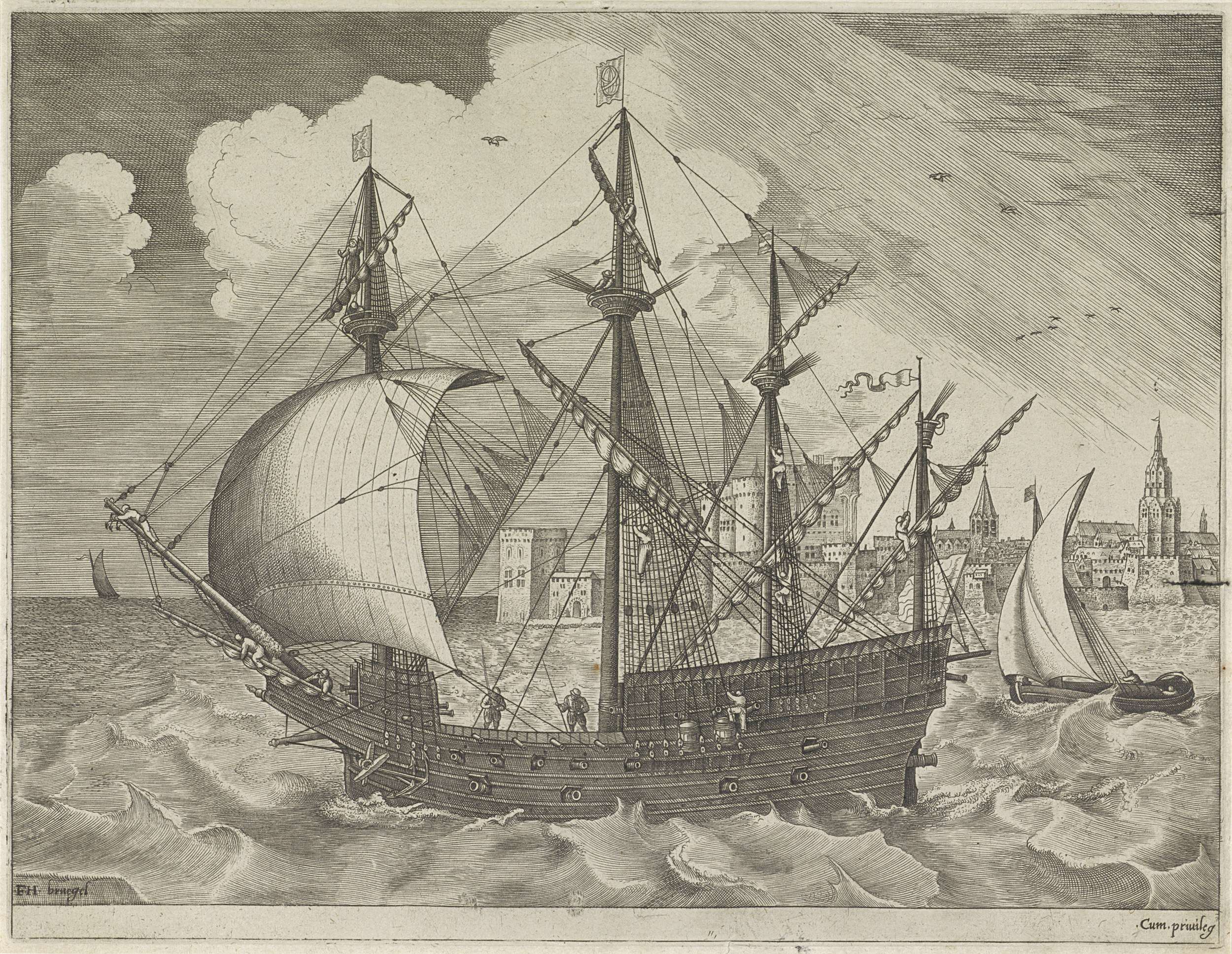 Driemaster voor anker bij een stad