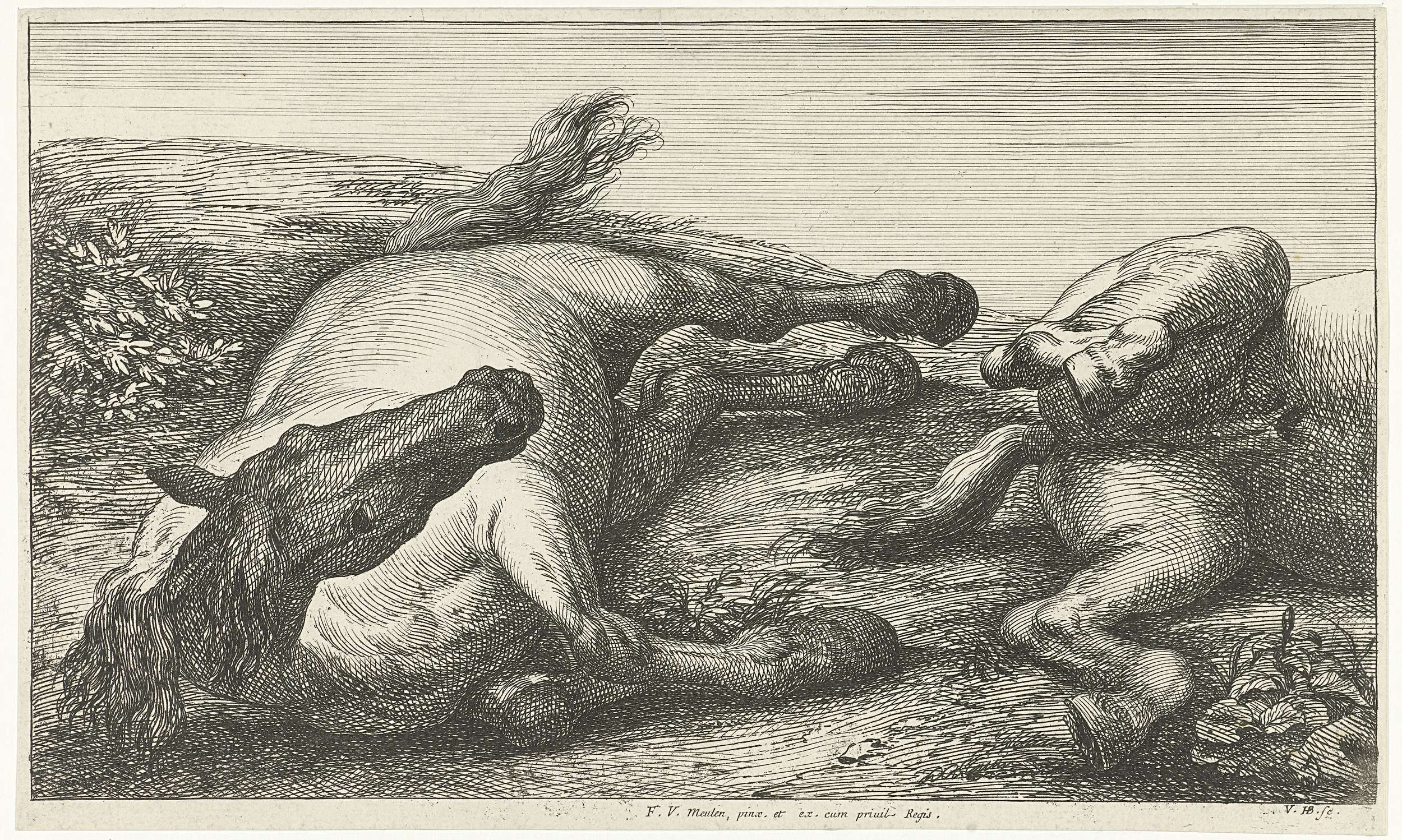 Twee gesneuvelde paarden waarvan de rechter van de z...
