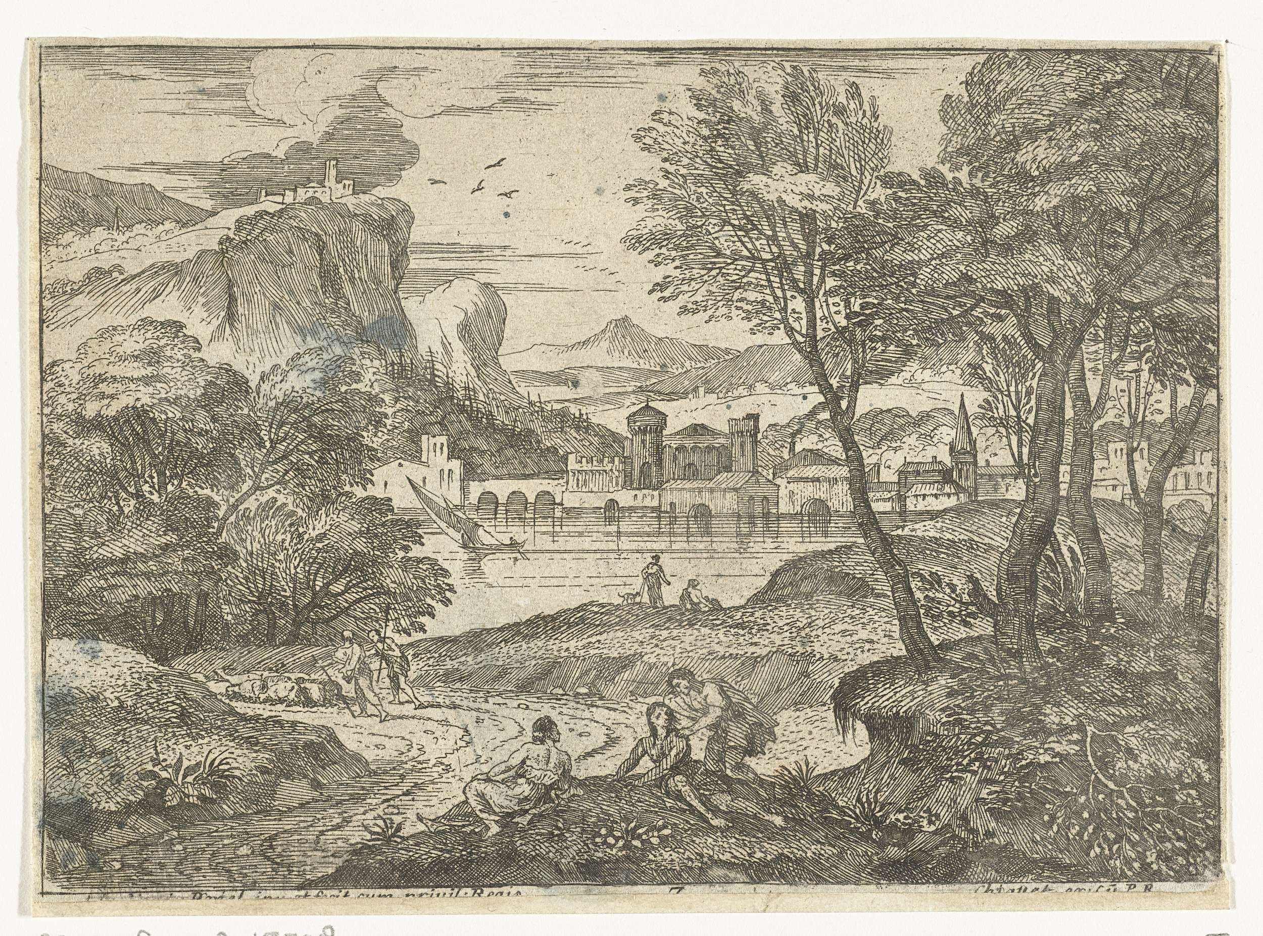 Landschap met drie personen langs pad