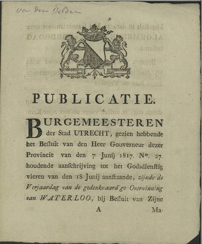 Plakkaat godsdienstig vieren overwinning Waterloo, 1817