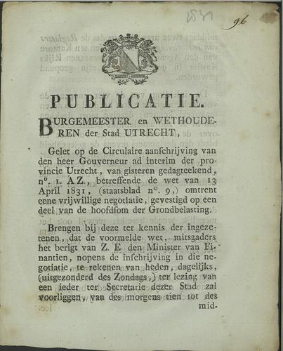 Publicatie vrijwillige negotiatie grondbelasting, 1831