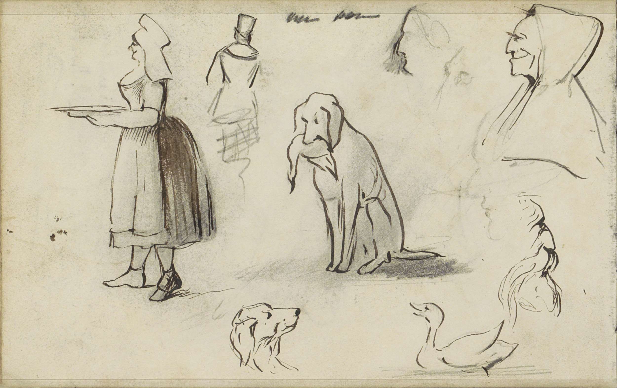 Studieblad, onder andere met een dienstmeid met schaal