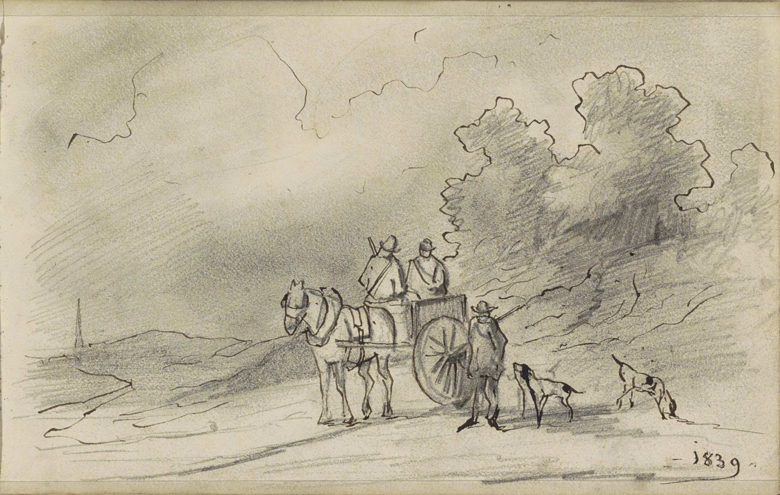 Paard en wagen met jagers en honden op een landweg