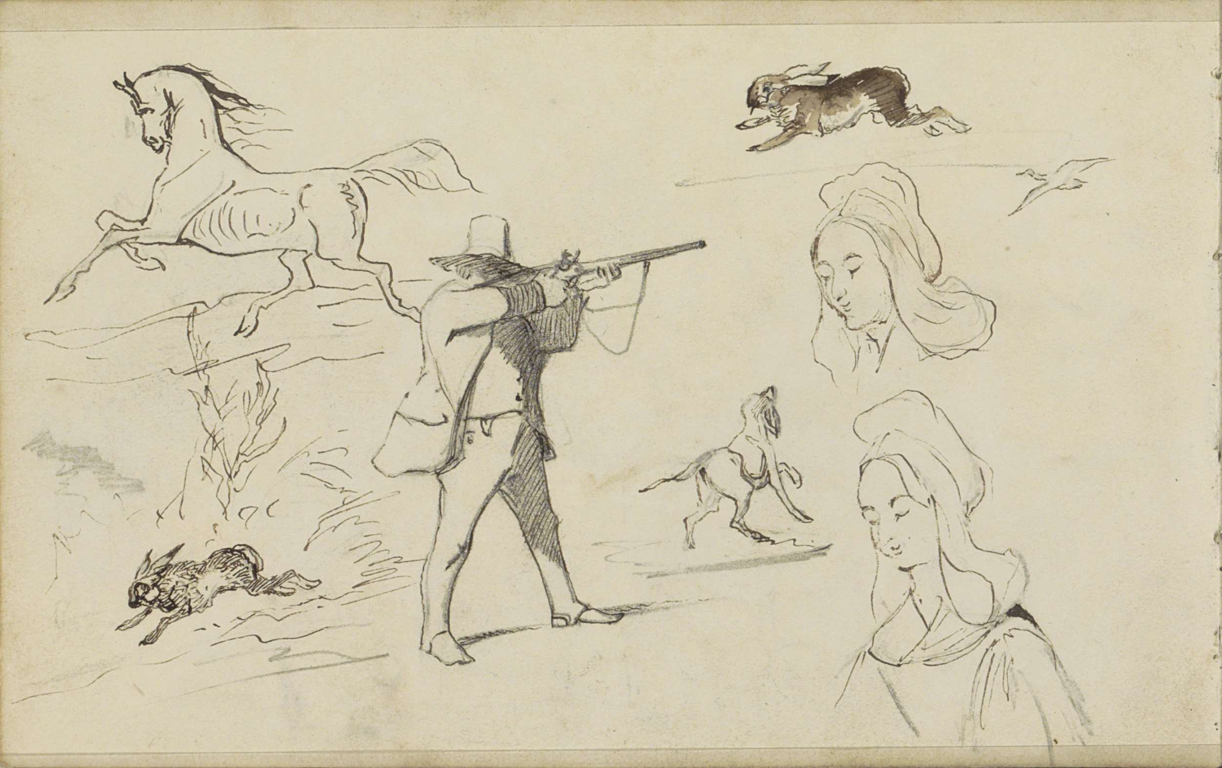 Studieblad, onder andere met een jager en hazen