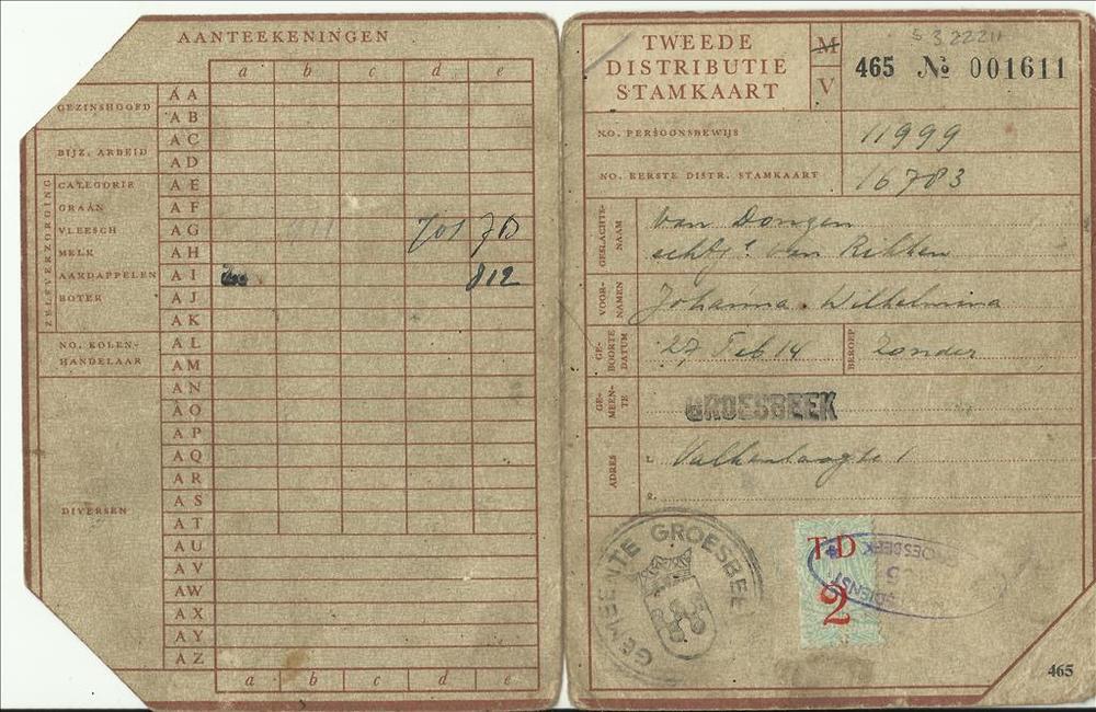 Tweede Distributiestamkaart op naam van Mevr J.W. Va...
