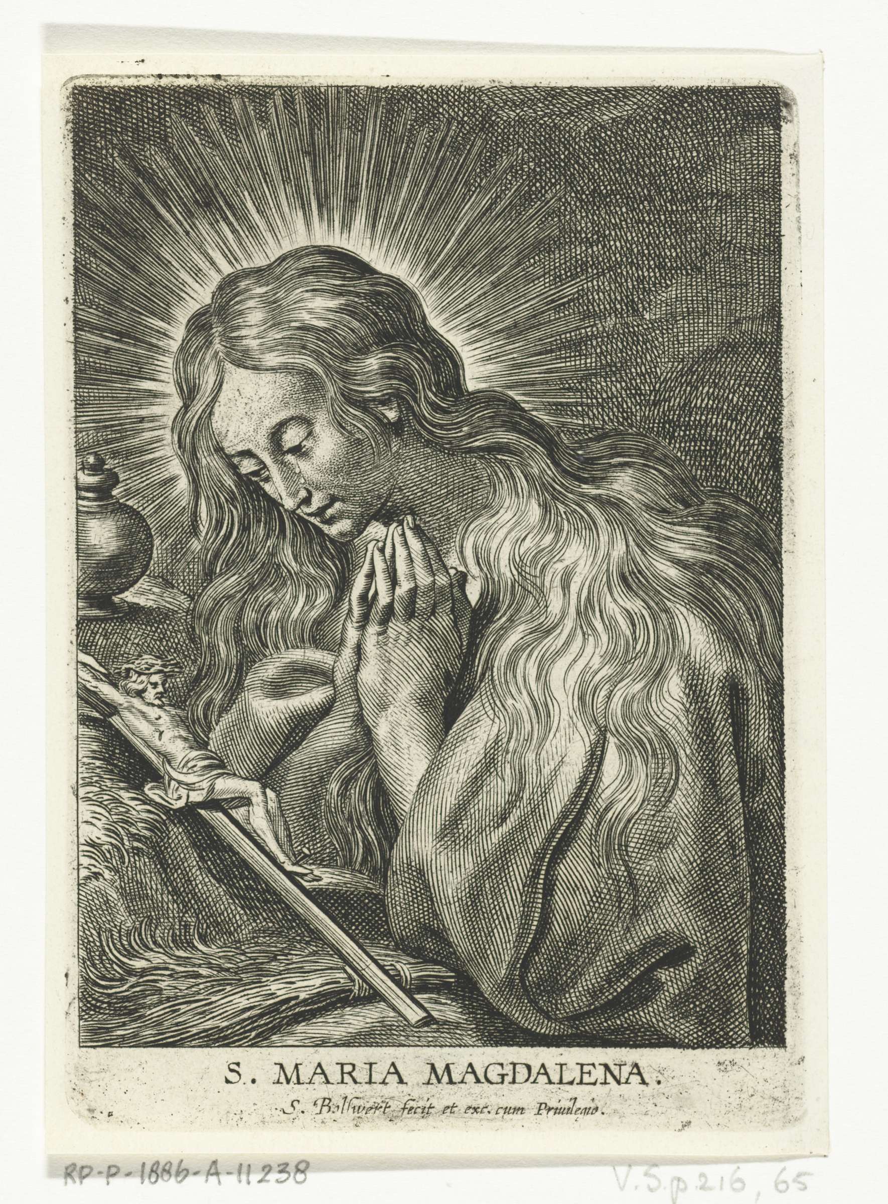 Maria Magdalena bidt geknield voor crucifix