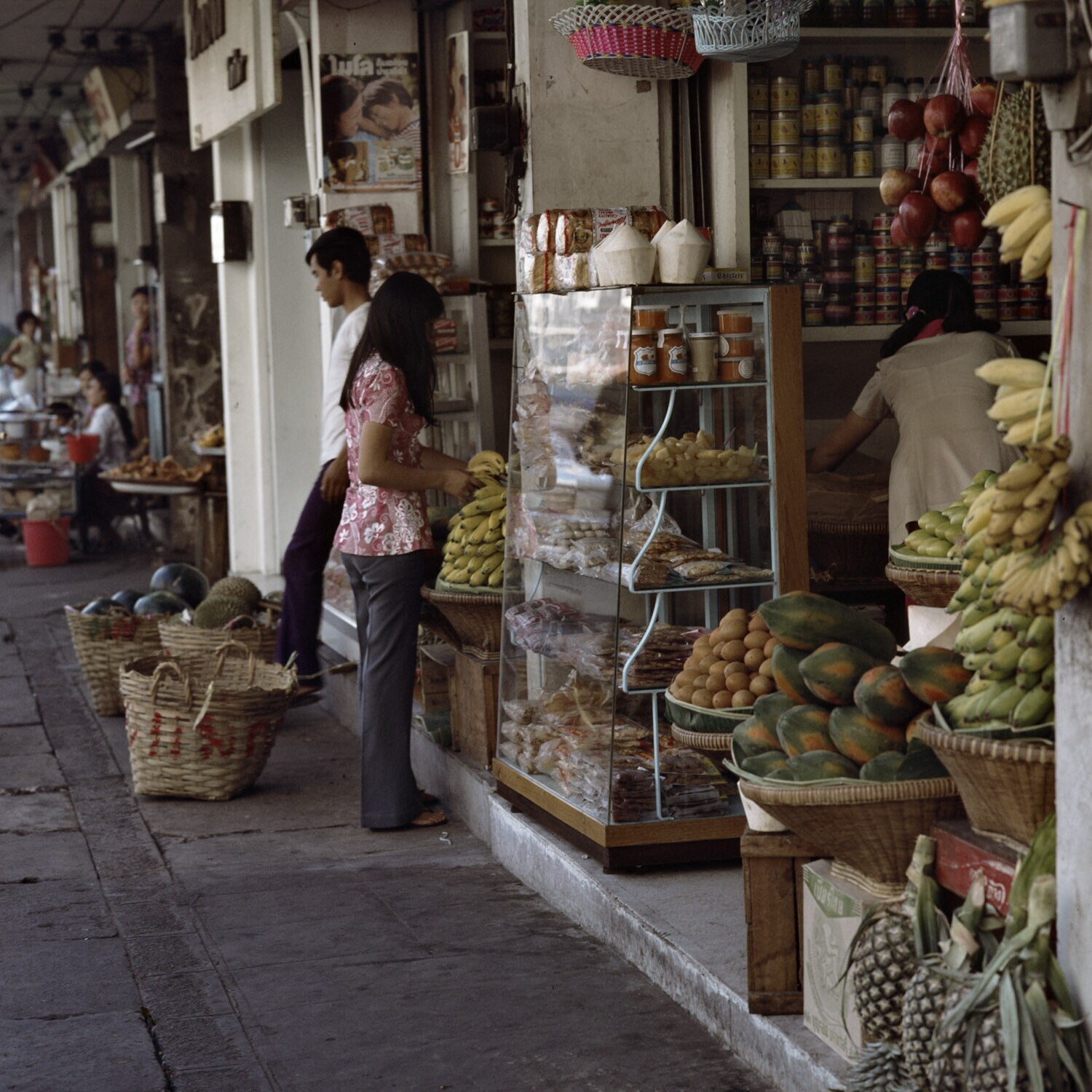 Winkelgalerijtje. Op de voorgrond een groente en fru...