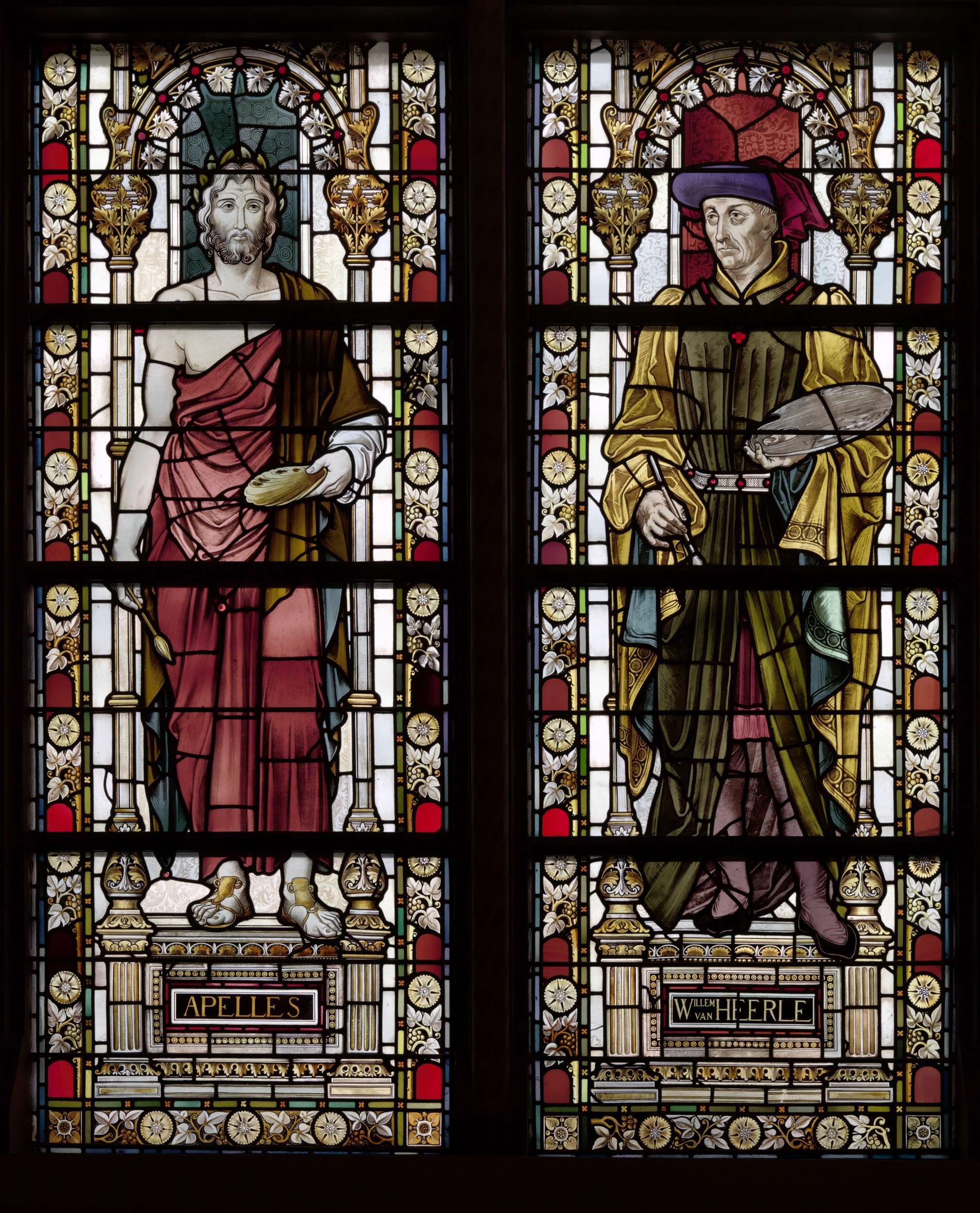 Twee gebrandschilderde ramen met voorstellingen van ...