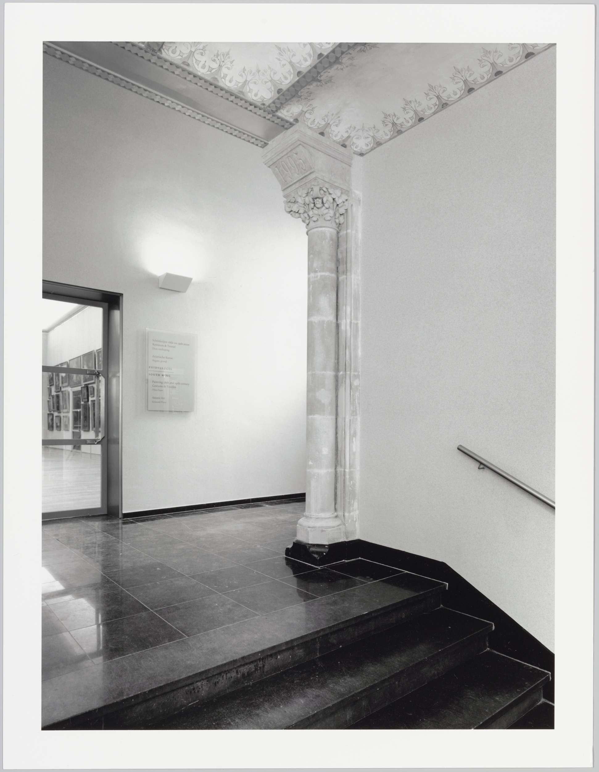 Gang met zuil en glazen deur waarachter een zaal te ...
