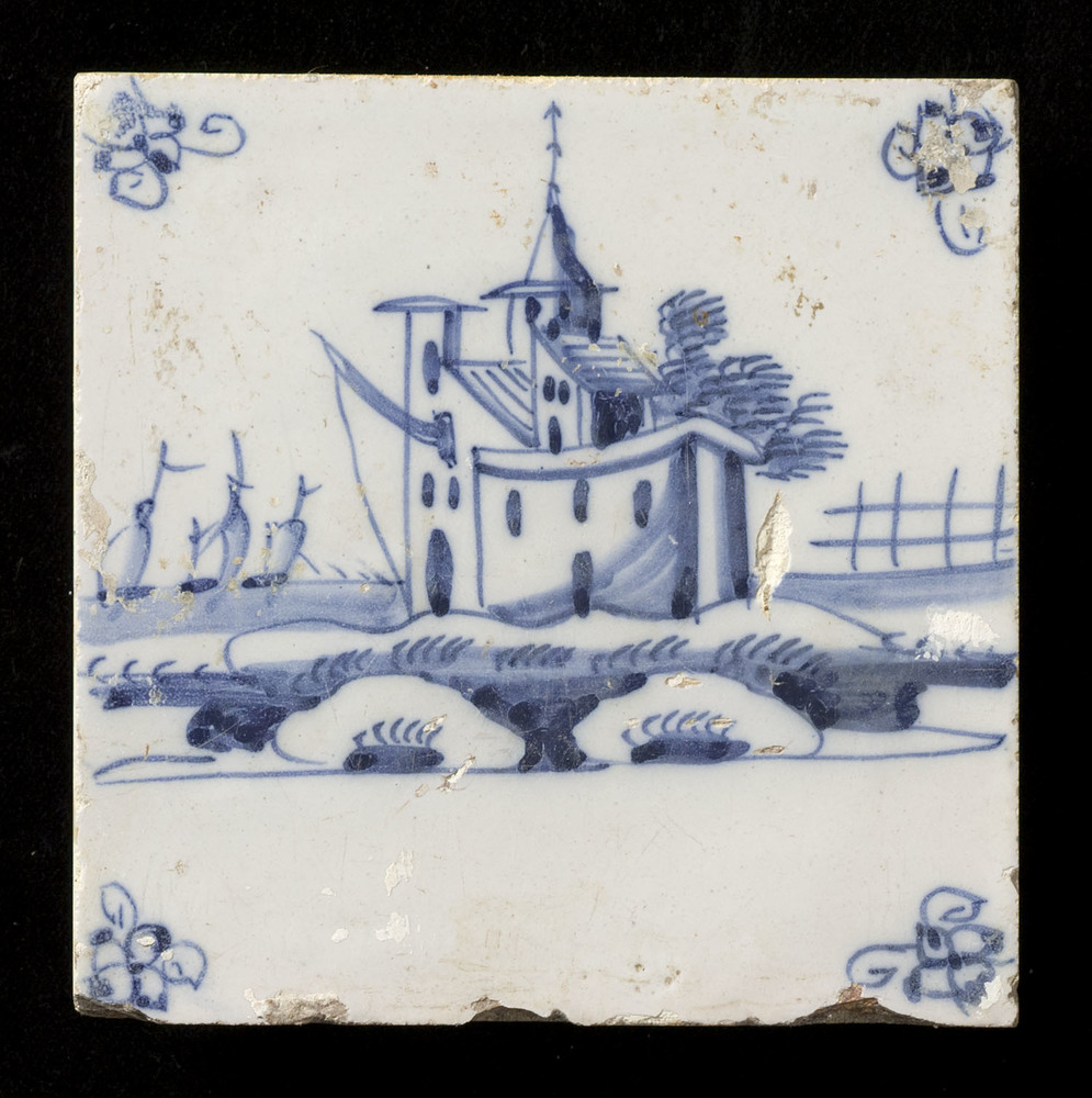 Tegel in tinglazuur, voorstellende landschap, vervaa...