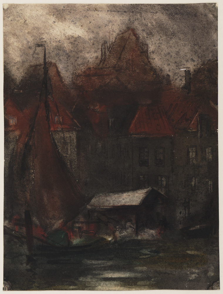 Zeilboot aan een kade met huizen