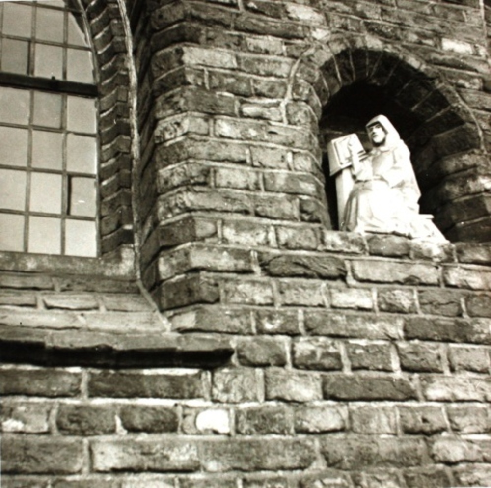 Beeldje van lezende monnik in gevel van Refectorium