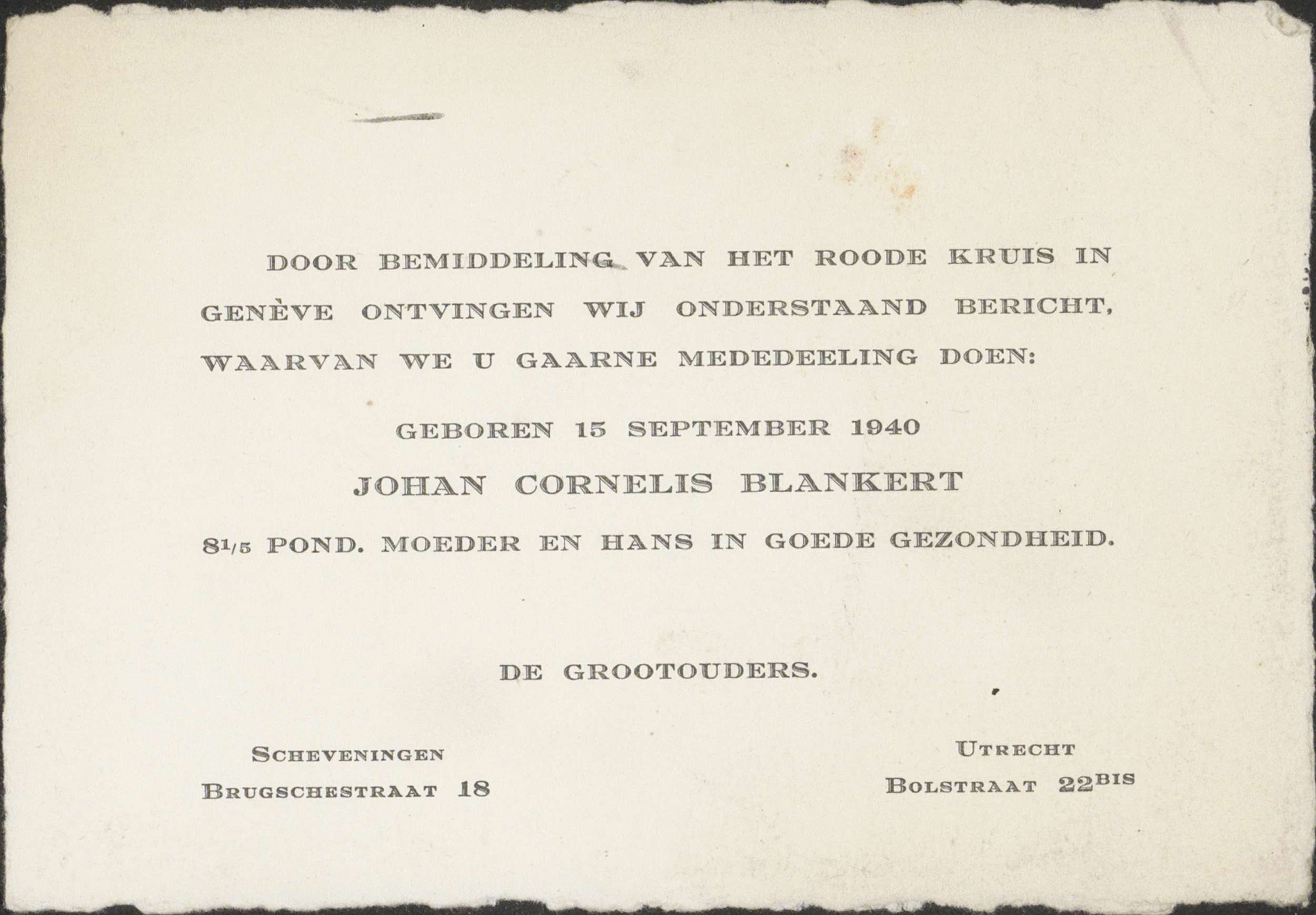Geboortekaart van Johan Cornelis Blankert, geboren 1...