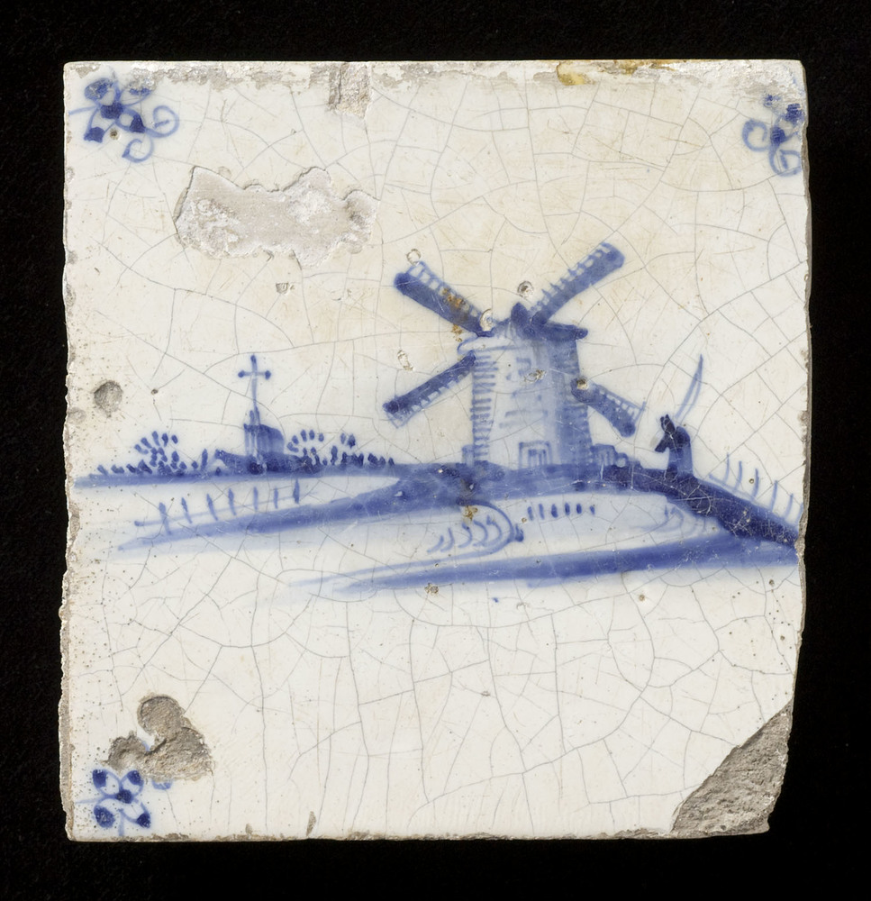 Tegel van keramiek, tinglazuur, voorstellende een bl...